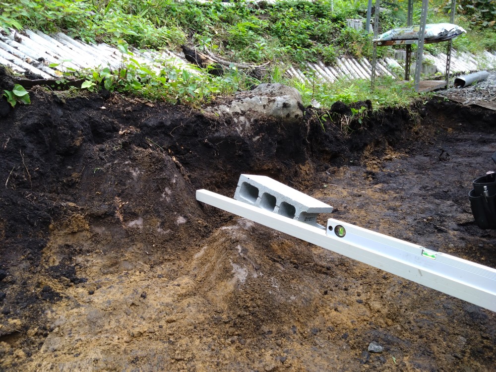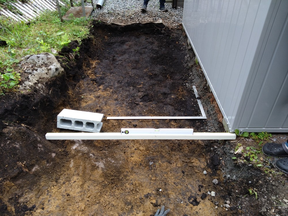 バイク保管庫の下地スキ土 9月25日(木) 既存物置横にハイルーフ豪雪型のバイク保管庫を設置するため余分な土を剥ぎ取りました。掘削すると今まで見えていなかったものが多数ありますが、今回は大きな巨石…この石を少し避けて設計設置位置を少しずらして、防草シートを敷き、5号砕石を敷き均し、建込みへと進んでいきます。 長野市 松本市 塩尻市 外構エクステリア