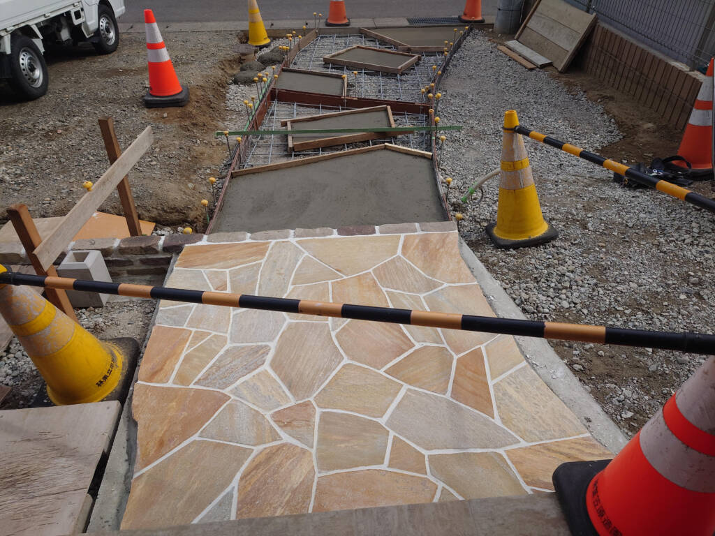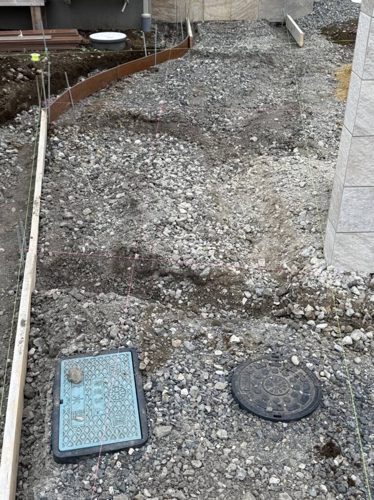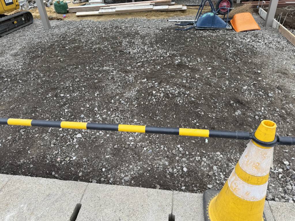 今日はこちらの現場で、スキ土とカーポートの穴決め、先日打設したベースコンクリートの脱型とハイフレックスの塗布をしました。今回はカーポートの設置が早まったため、カーポートの柱付近のスキ土と、穴決めをしました。重機を使い、全体をすいてから、土間の高さからレベルを出して、柱の穴を掘りました。土質が砂っぽくすきとりやすかったので、柱の穴は手掘りであらかた堀り、土を重機で積み込む形で作業をしました。最後に砕石を入れ、たこでよくつき、コンパネで蓋をしてバリケードで囲いました。また、リビオを敷く部分のベースの枠もとれそうだったので、脱型をしてハイフレックスを塗りました。リビオの施工ですが、土間がカーブしていて、リビオもそれに合わせて加工しないといけないため、少し大変な作業になりそうです。