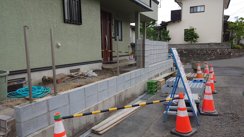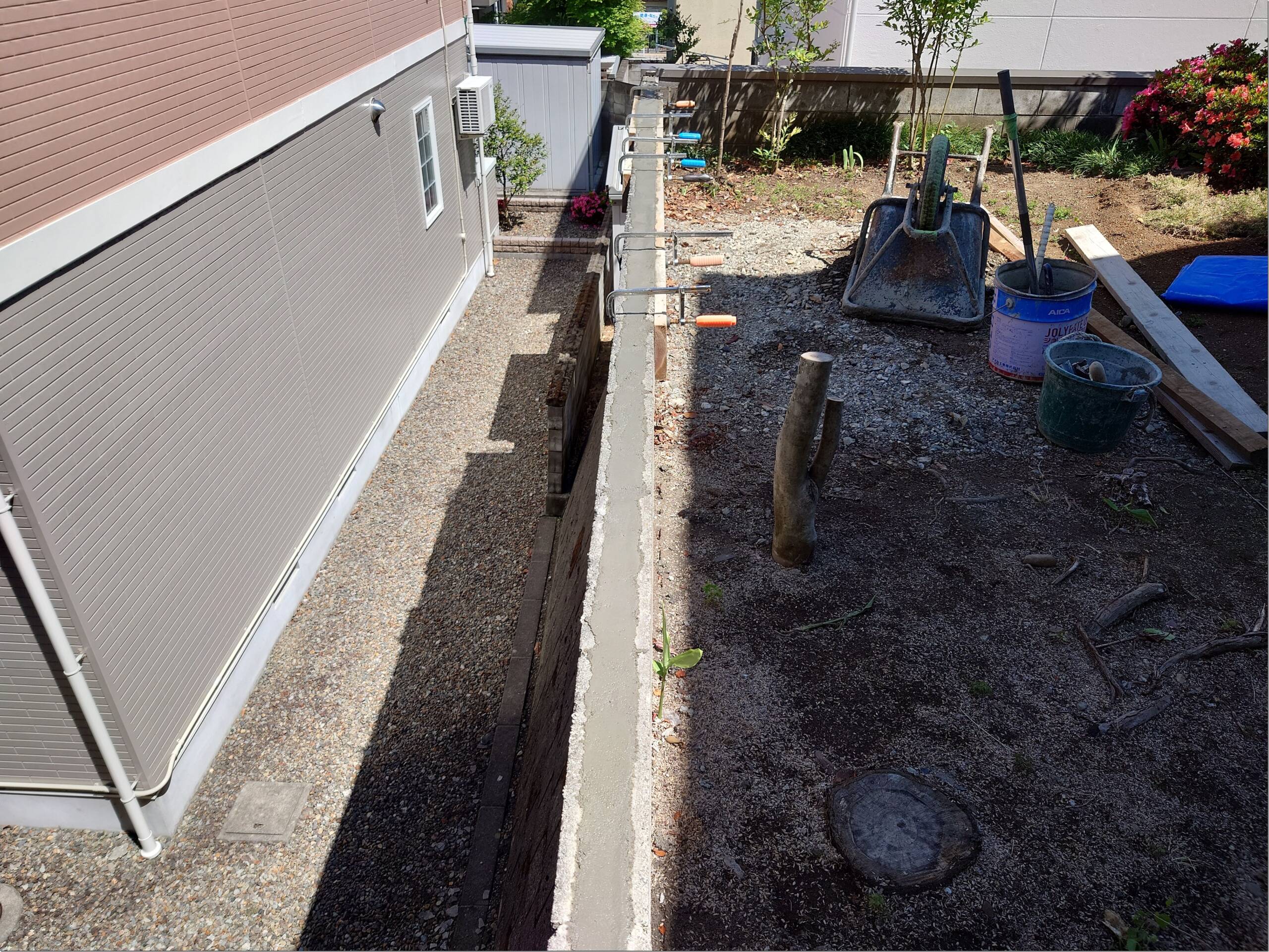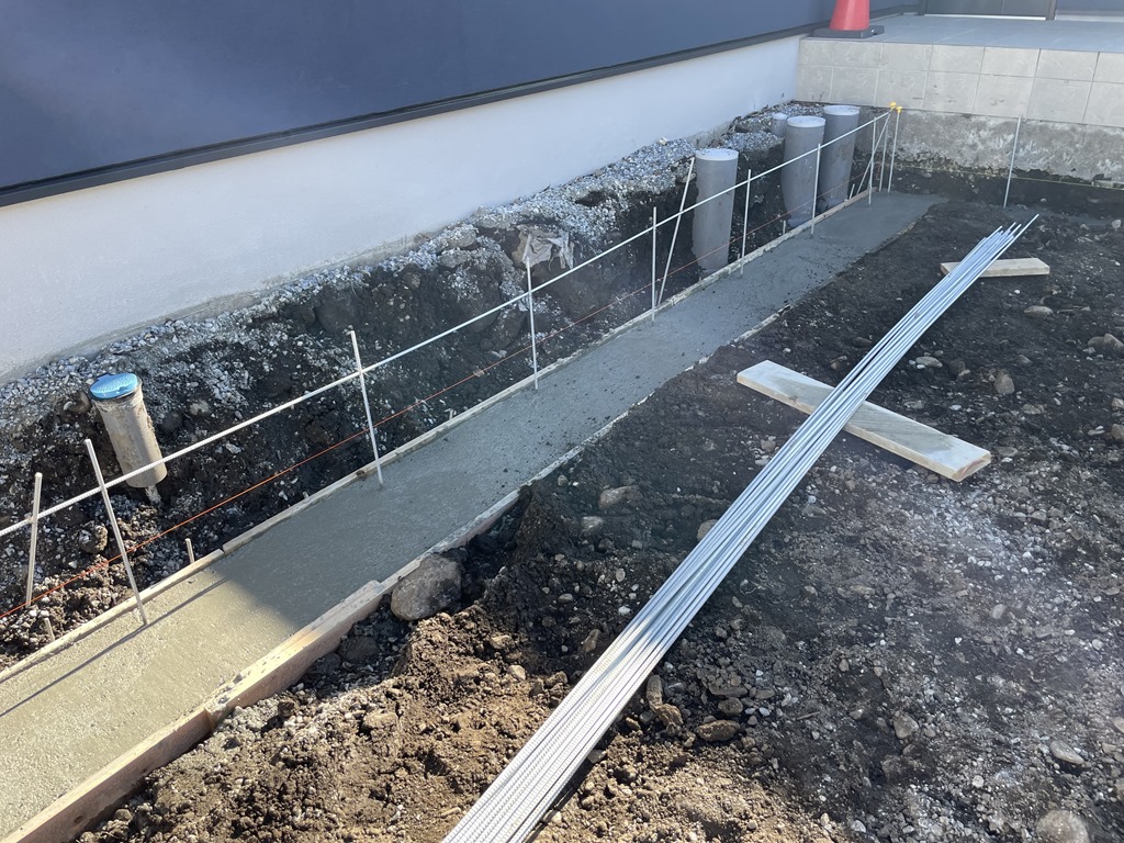 こちらの現場では、フェンス柱の設置作業を行いました。フェンス柱を据える時まず両サイドに柱を据えて仕上げの高さで糸を貼りその高さに合わせて残りの柱も据えていきます。据えられたら根元にモルタルを入れ固定していきます。