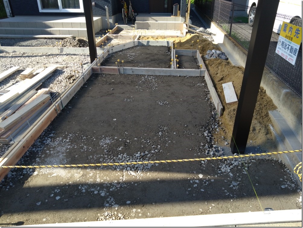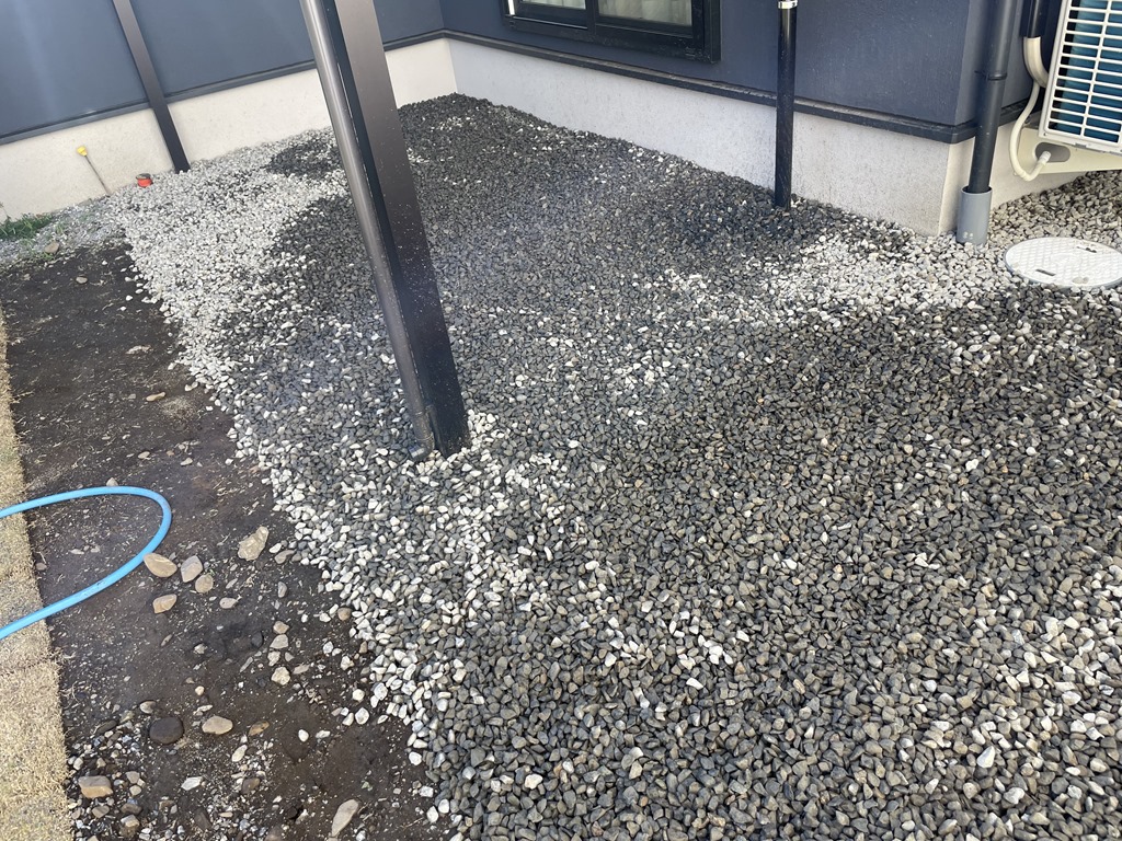 こちらの現場では、芝の下地作業を行いました。芝を張る際砕石、砂で下地を作ります。前々から砕石は引き終わっていたので今回は砂を入れました。芝が3センチあるので仕上げから3センチ下げで仕上げていきます。砂を入れ、トンボで全体を均し、均し終えたらプレートで転圧し下地が完成します。