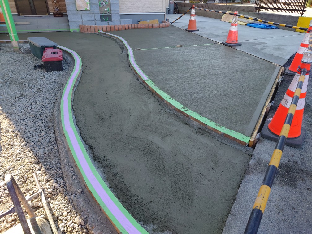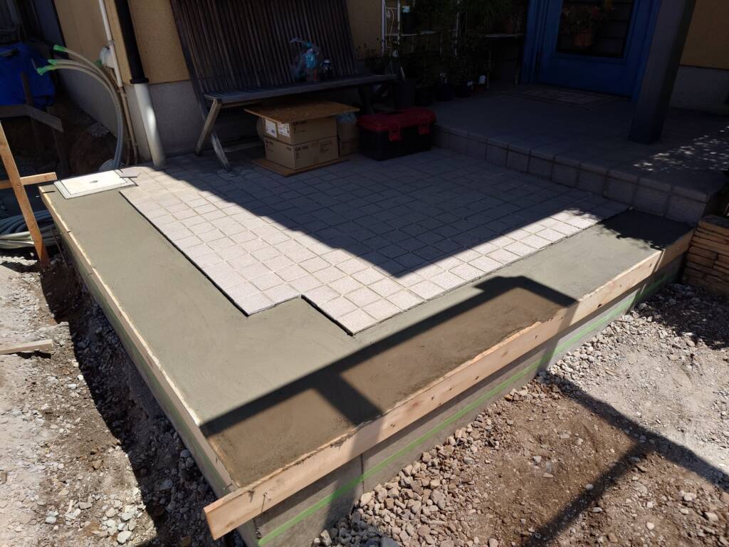 今日は玄関前での作業になりました。事前に打設したベースコンクリートに型枠ブロックを積んで基礎を作り、東洋工業のプレックスのノヴェルボーダーを積んでいきました。この商品を今回初めて取り扱うことになりました。素地ブロックに予め石材が貼り付けてあり、このまま積むことで表面が仕上がった状態になるというものです。持ってみるとタイルが貼り付けてある分重いです。通常の素地ブロックが20㎝あるのに対しノヴェルボーダーは15㎝と高さが少し低いです。重い商品を積み上げるので足場をしっかり確保しながら積んでいきます。亜鉛メッキ鉄筋を使用し錆にも強い門柱を作っていきます。