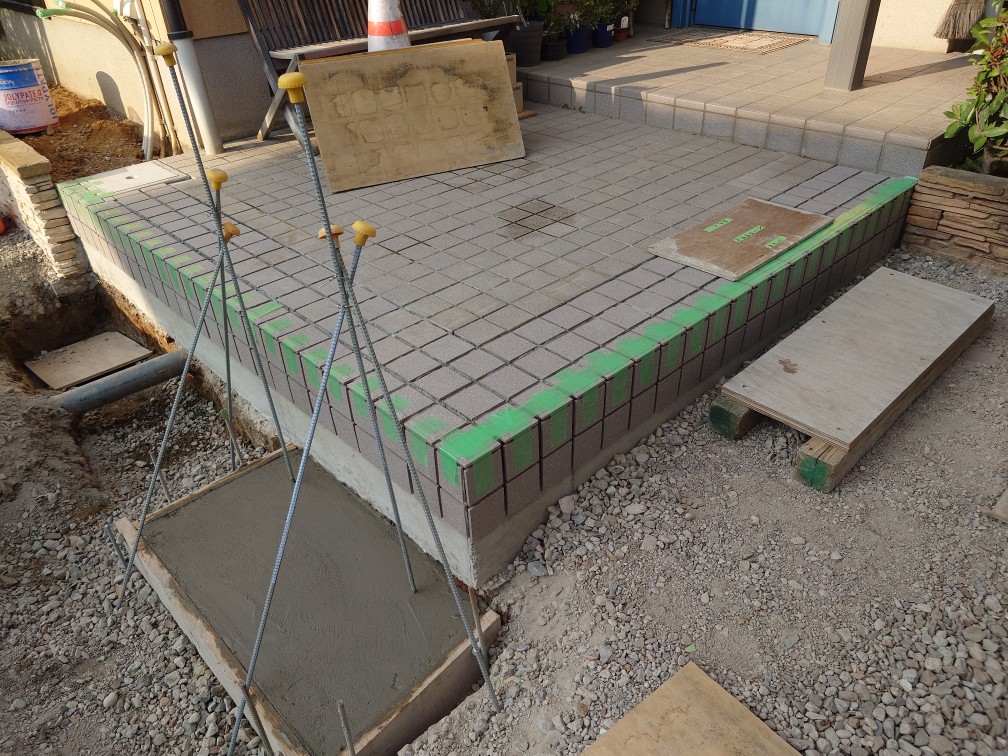 別の箇所でもノヴェルボーダーを使った門柱を積むため基礎ブロックを積みました。