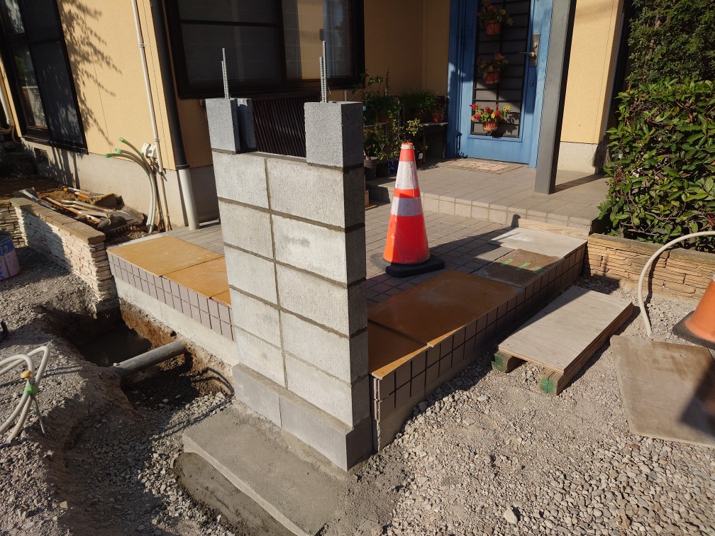 砕石、スタイロ、門柱タイル、笠木