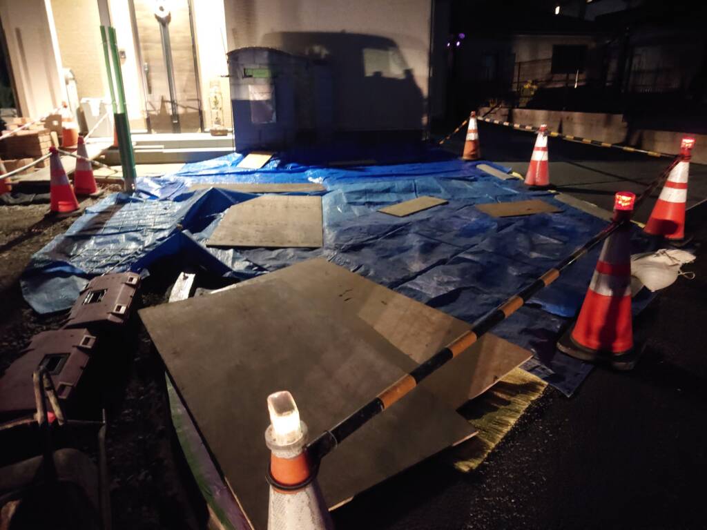 この現場では、土間の砕石搬入と慣らし、スタイロの設置をしました。重機で砕石を入れ、レーキなどで高さを見ながらならします。高さが決まってきたらプレートをかけて、改めて高さを見ながら仕上げていきます。スタイロは道路側のわきに入れるので、入る分まですいてから砕石で押さえて固定します。手前の部分はお客様が通る場所になるので、道板を敷いて作業を終えました。