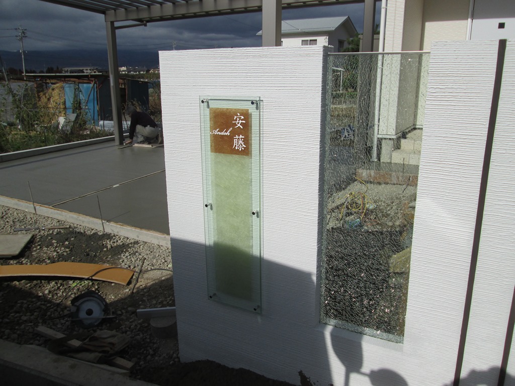 塗り仕上げとH鋼門柱 3月11日(金) 壁塗りをしました。模様はウェーブです。 距離があるので、小口を先に仕上げました。 H鋼にガラスのゴロタ石を敷き詰めて、ガラスサインで蓋をしました。 中にはLEDテープが入っているので、夜になると柔らかく光りとても綺麗です。 2本のH鋼のあいだにジュエルグラスを入れました。
