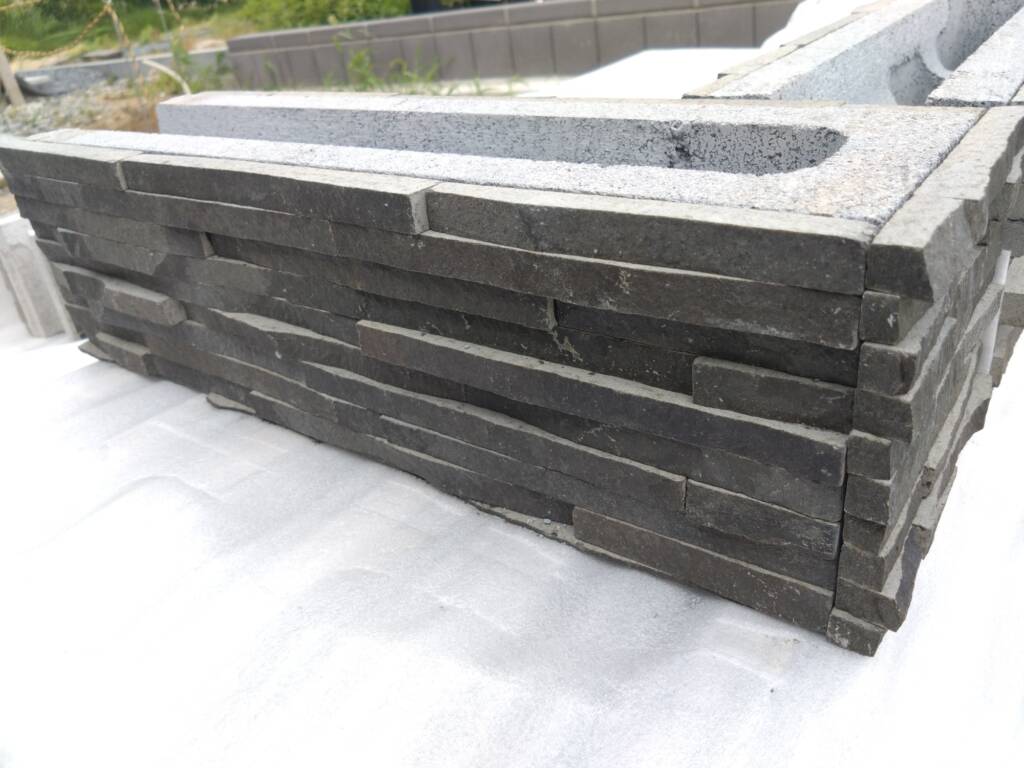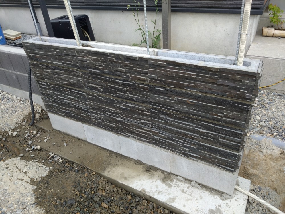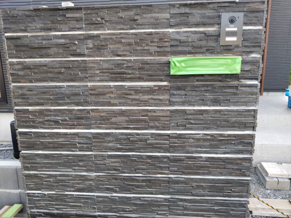 東洋工業のプレックストーンを積み上げました。ポスト下は施工上化粧材をくり抜いてしまうため加工用の化粧パネルを貼り付ける必要があります。隣同士の目地や模様に合わせて貼り付けました。そしてお客様からの支給品のインターホンの設置を行いました。インターホンの台座になるベース枠を固定するため、本体のサイズに合わせてくり抜く必要がありました。これが一苦労。なんとか周りを傷付けずに設置して配線を接続しコーキングで防水処理を行いました。続けてブロック天面付近にLIXILのシンプルラインライトを取り付けました。取り付けホルダー部分にくる化粧材を外してビスで固定します。早くも夜の点灯が楽しみです。