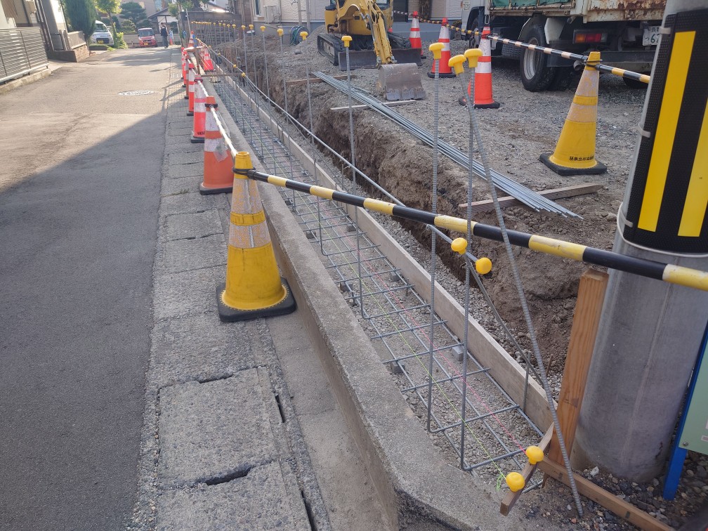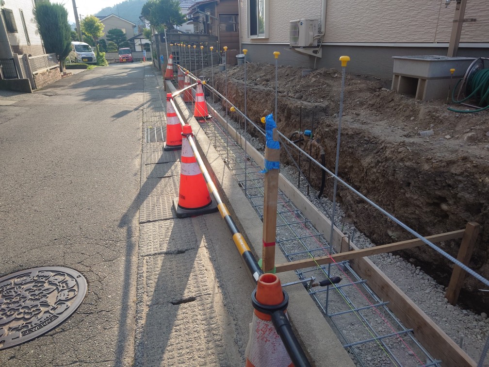 今日は玄関前での作業になりました。事前に打設したベースコンクリートに型枠ブロックを積んで基礎を作り、東洋工業のプレックスのノヴェルボーダーを積んでいきました。この商品を今回初めて取り扱うことになりました。素地ブロックに予め石材が貼り付けてあり、このまま積むことで表面が仕上がった状態になるというものです。持ってみるとタイルが貼り付けてある分重いです。通常の素地ブロックが20㎝あるのに対しノヴェルボーダーは15㎝と高さが少し低いです。重い商品を積み上げるので足場をしっかり確保しながら積んでいきます。亜鉛メッキ鉄筋を使用し錆にも強い門柱を作っていきます。