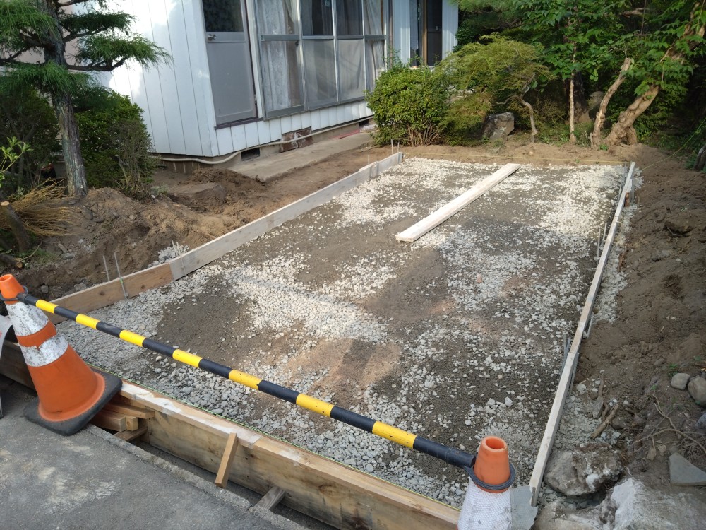 先日据え付けたプラーガブリックにジョイサンドハード(固まる珪砂)を入れて道路際を仕上げて車の乗り入れが出来るようになりました。土間スリットのファイバーレジンとアプローチのリンクストーンも硬化が確認が出来たのでバリケードを開放しました。リンクストーン内に埋め込んだ犬をかたどったワンポイントも綺麗に仕上がり、お客様にも喜んでいただきました。残工事に植栽が残っているのでもう少しで完了になります。冬場から着工させていただき春先までコンクリート打設をお待ちいただいてようやく竣工になります。お客様にも車両の移動等ご協力いただきありがとうございました。