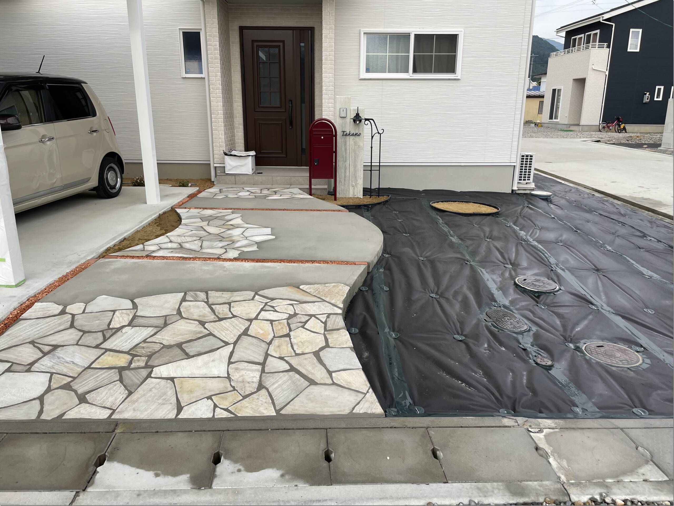 別の現場ではアプローチに天然石の乱形張りを施工しています。使う石材はアースクォーツでトレドではよく使用するものになります。中心部をあえて張らずにファイバーレジンで仕上げます。