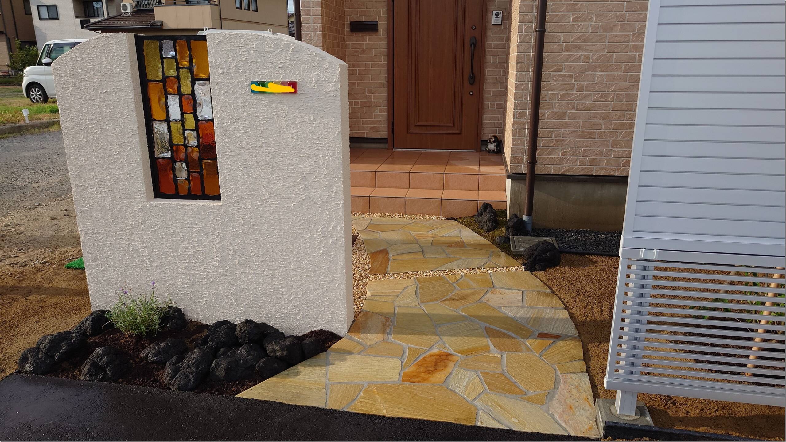2023年12月19日 アプローチ(通路)、エクステリア工事、人工芝、塗仕上げ、外構工事、板石、門柱工事 toledo