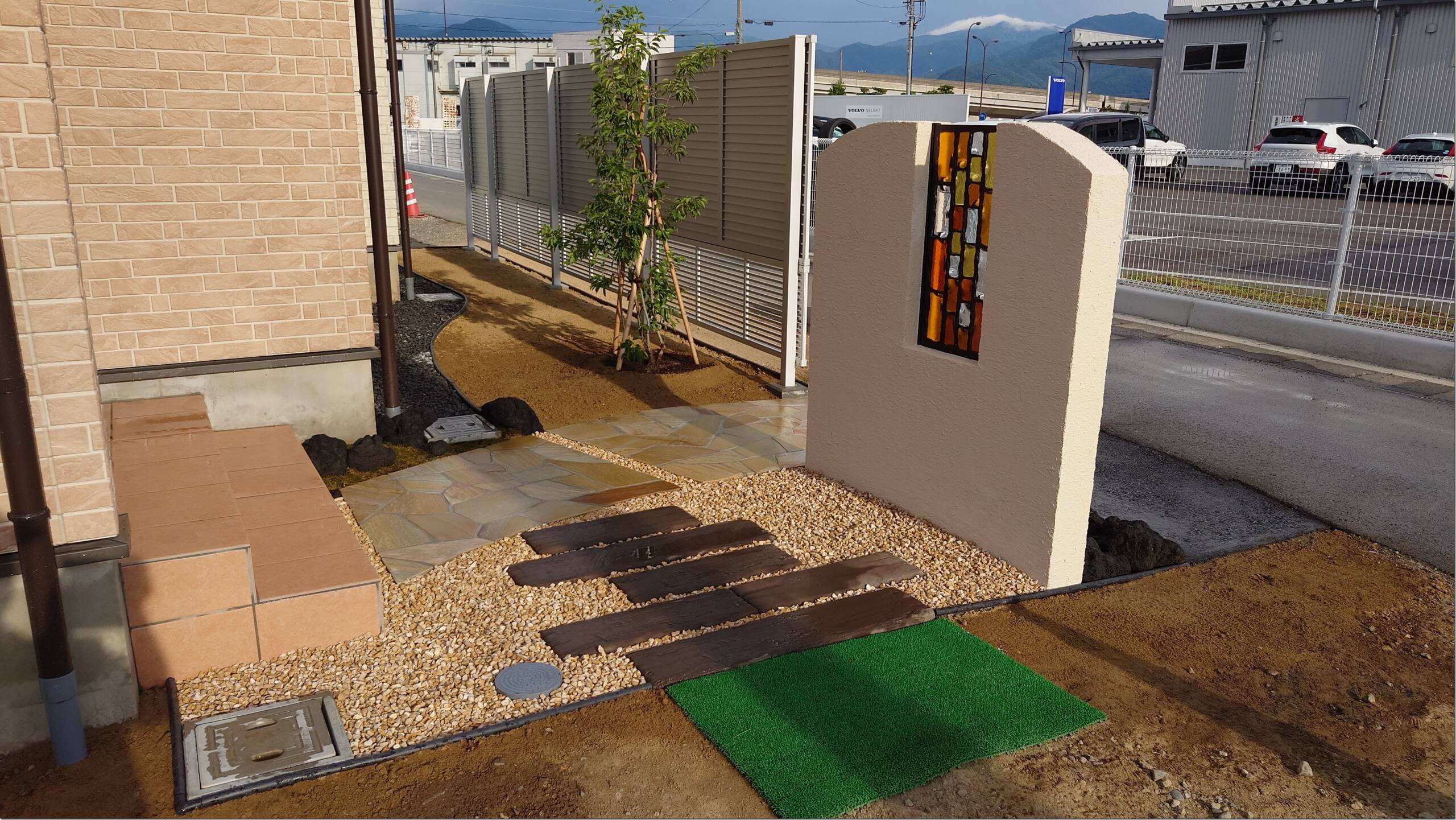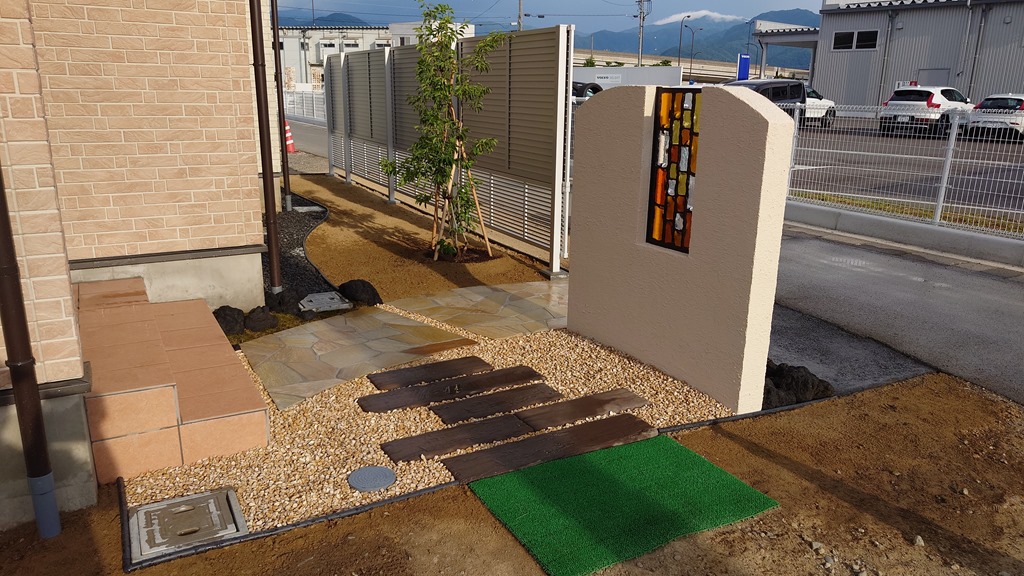 ランダム張りの板石のカルムぺイブ周辺と庭全体に人工芝張り。人工芝の下は、砕石路盤転圧後に砂で不陸調整し、防草シートを張り、人工芝張りとなります。下地がしっかりとしているので、でこぼこしたり、雑草が生えたりなんてことはないでしょう!