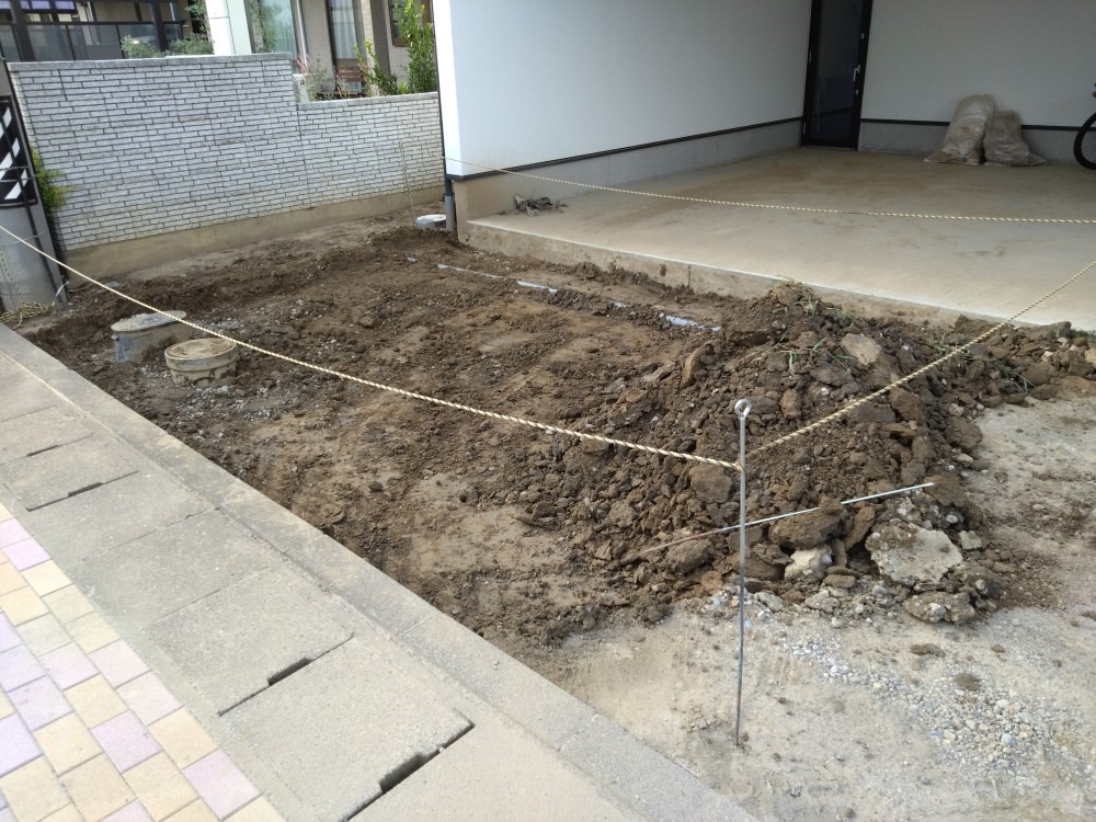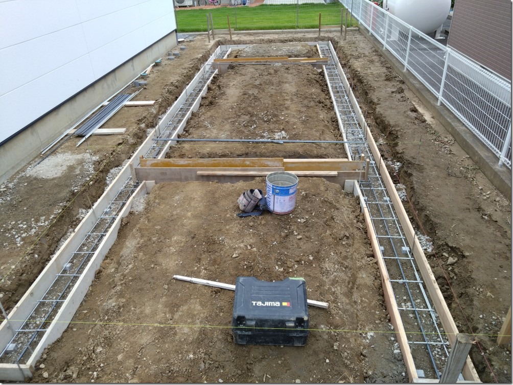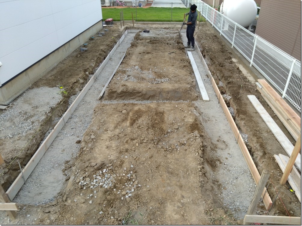放射冷却により朝は凄く冷え込みましたが日中は暖かく作業しやすい日でした。現場作業も予定以上に捗りました。昨日打設したタイルテラスのベースコンクリートの脱型をし、余分なバリを取り除き清掃しました。同現場で敷地の周りにはリクシルのABフェンスys3型を取り付けるため柱を建て込みました。テラス腰壁の正面には花壇を作るのでブロックのベースコンクリートを打設していきます。