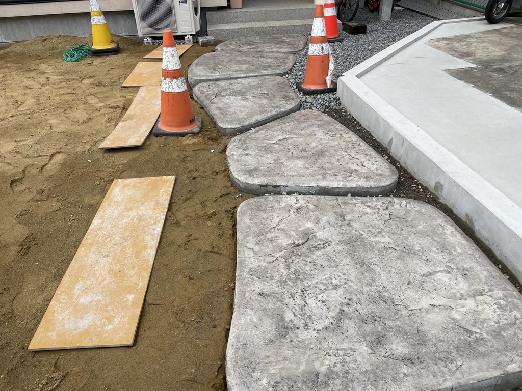 比較的天気が良いところでカルムぺイブという板石を並べました。1枚のサイズが30㎝×60㎝の厚み4㎝になります。色はクラリーイエローというベージュっぽい黄色になります。あとは周りは人工芝になる計画です。