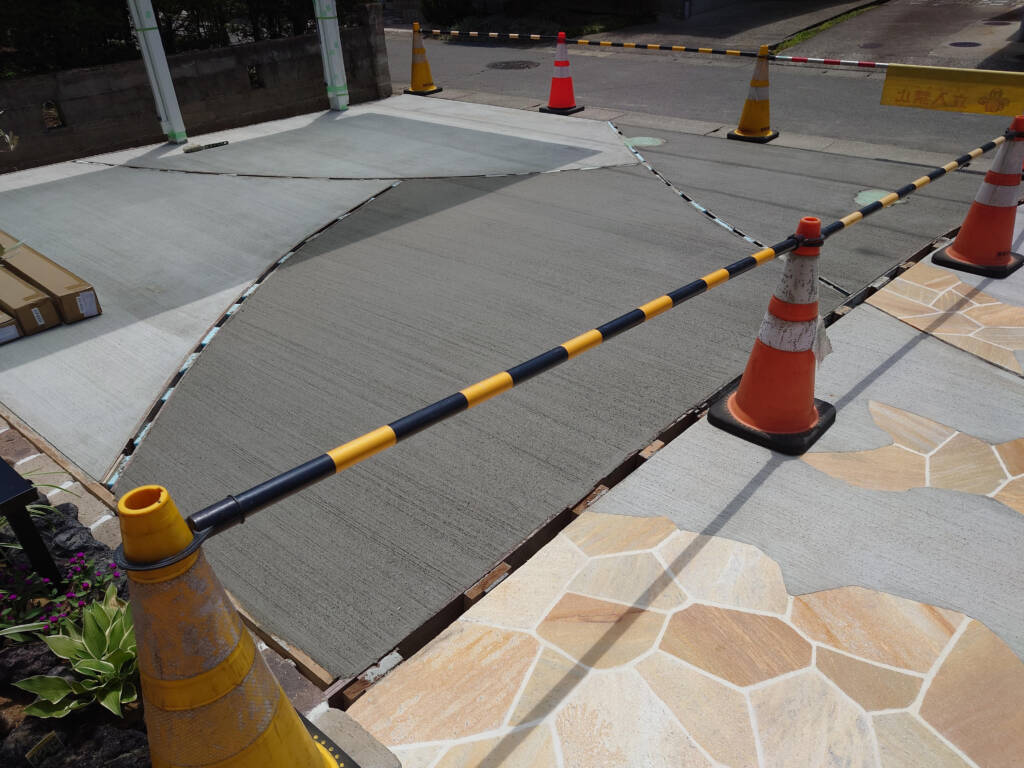 土間打設 6月30日 (月) こちらの現場では、土間の打設作業を行いました。まずプラ鏝を使い均していきます。そのあと生コンの状態を見ながら金鏝で均していきます。最後に刷毛を引いていきます。刷毛を入れるタイミングが早いとコンクリートを引っ張りすぎてしまい、逆に遅いと刷毛の跡がつかないのでタイミングを見て引いていきます。刷毛引き仕上げにすることで滑りにくくする効果もあります。今週はとても暑い予報なのでしっかり水分補給をしながら作業を行っていきます。