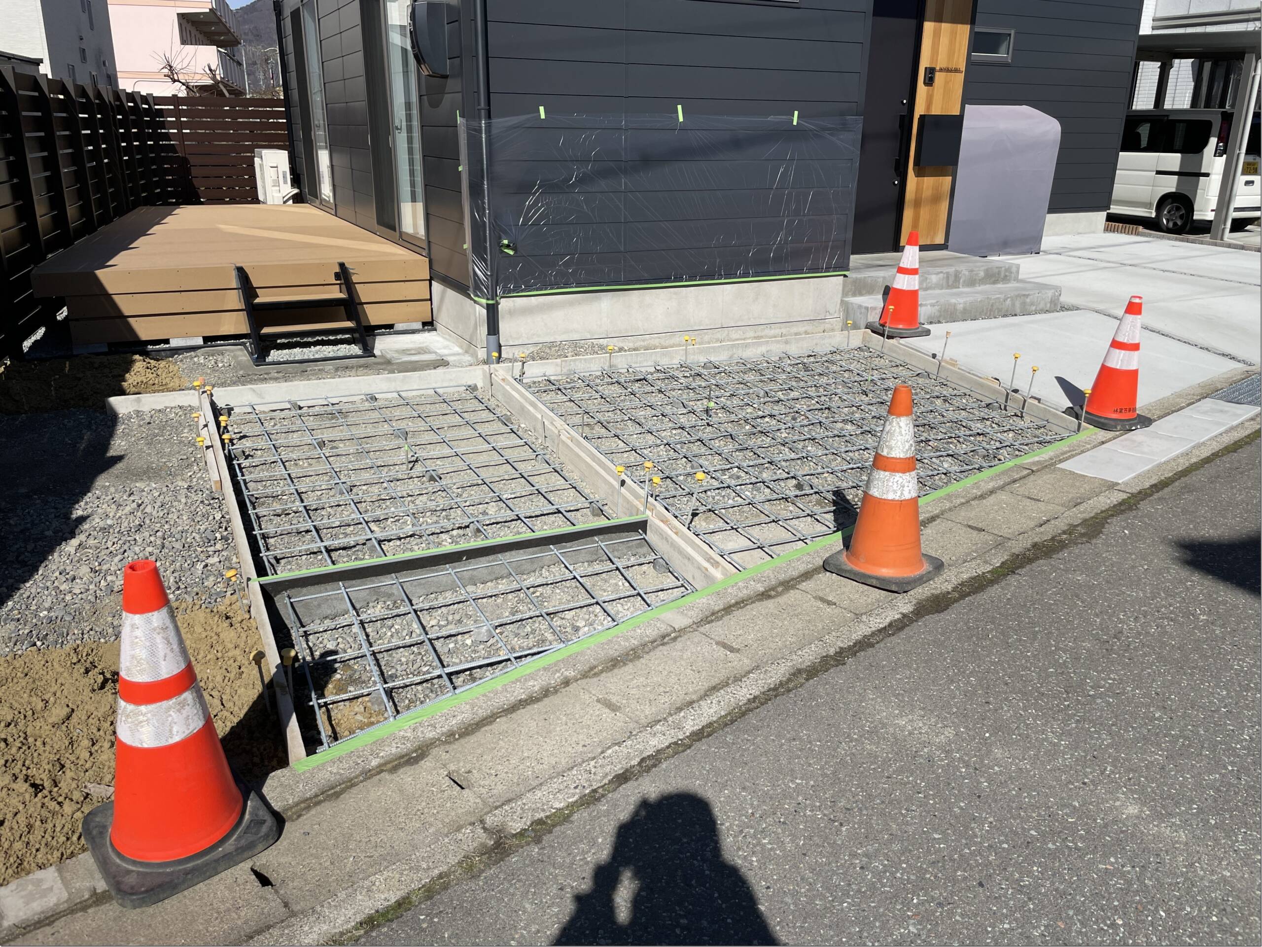別の現場では駐輪場となるフーゴミニの下をコンクリート打設しました。狭いスペースでの作業となったため仕上げまで大変でしたが綺麗に収まりました。