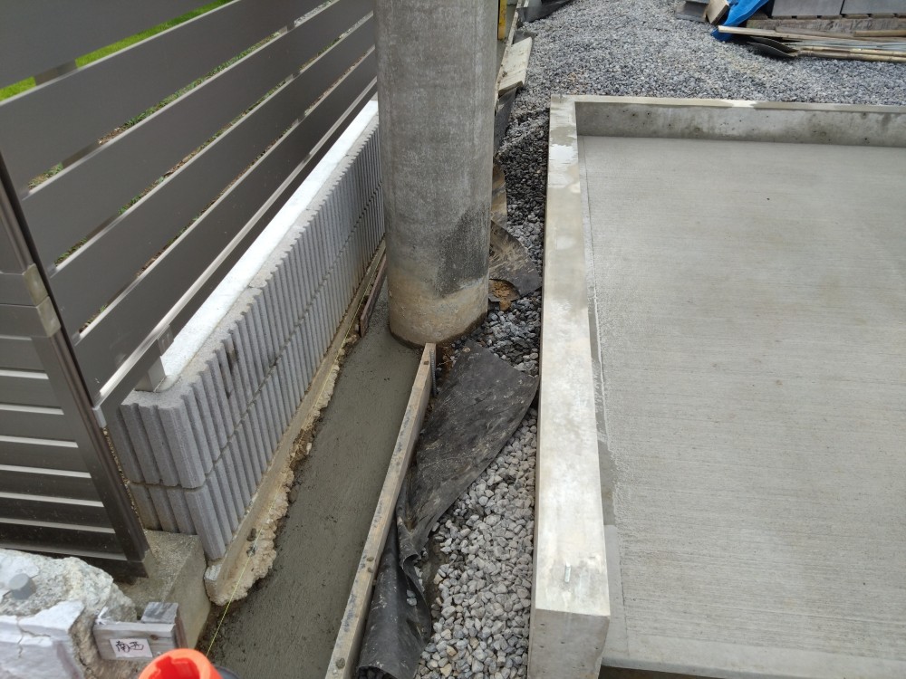 こちらの現場では、ブロックのベース打設とスキ土、砕石搬入作業を行いました。寒い日に生コンを扱う際は凍結防止のため防凍材を使用していきます。今回使用するブロックは化粧ブロックのスクエアⅭという商品で色はダークグレーになります。建物の横にはスマートエッジという縁石を据えていきます。