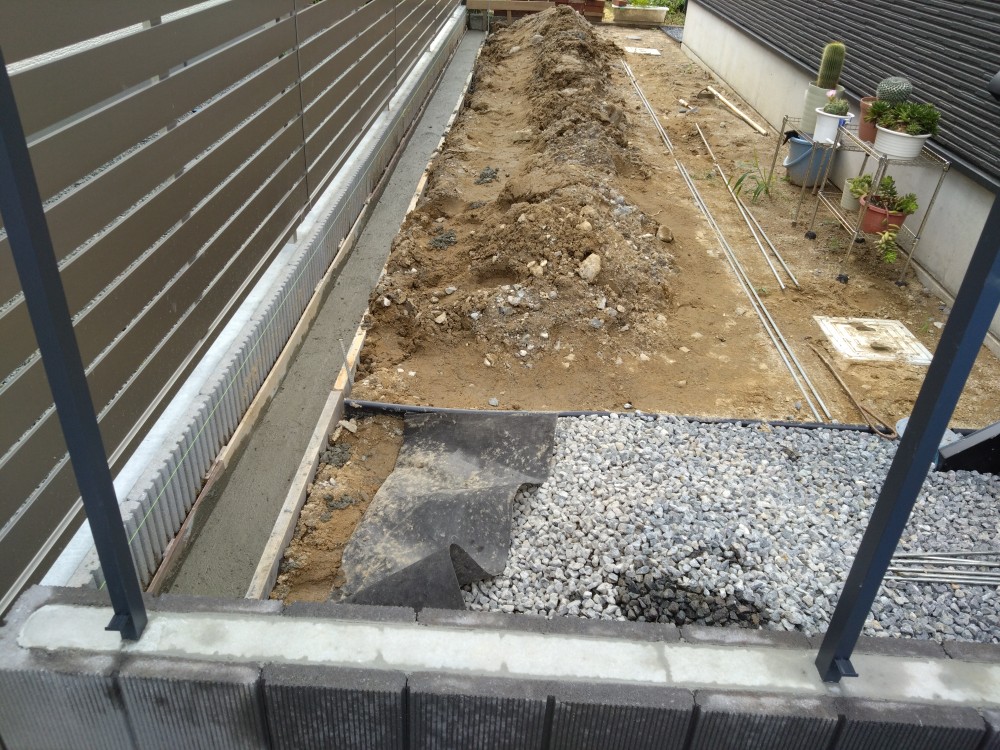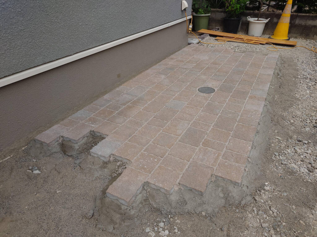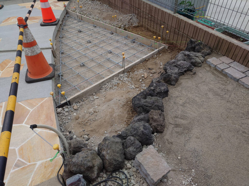 こちらの現場では、インターロッキングの据え付け、リビオ下地、浅間石での土留め作業を行いました。インターロッキングは砂下地なので砂を入れたときに水平を取りながら均していきます。砂が水平でないとインターを置いたときに水平が取れずガタガタしてしまう原因になってしまいます。インターを置いた時も長い定規などを置いて全体が水平になっているかも確認します。リビオの下地作業ではベースを打設するので型枠を組み配筋も行いました。後日ベース打設になります。浅間石の土留めでは浅間石と浅間石の間の隙間ができないようにします。隙間があると砂が流れて行ってしまうことがあるので石と石を重ねるイメージで置いていき隙間をなくしていきます。