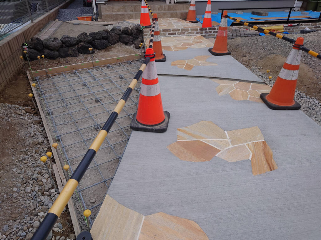先日据え付けたプラーガブリックにジョイサンドハード(固まる珪砂)を入れて道路際を仕上げて車の乗り入れが出来るようになりました。土間スリットのファイバーレジンとアプローチのリンクストーンも硬化が確認が出来たのでバリケードを開放しました。リンクストーン内に埋め込んだ犬をかたどったワンポイントも綺麗に仕上がり、お客様にも喜んでいただきました。残工事に植栽が残っているのでもう少しで完了になります。冬場から着工させていただき春先までコンクリート打設をお待ちいただいてようやく竣工になります。お客様にも車両の移動等ご協力いただきありがとうございました。