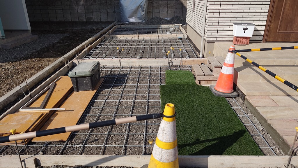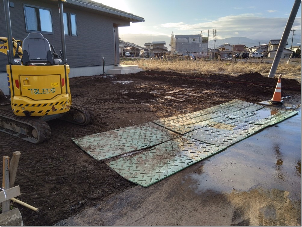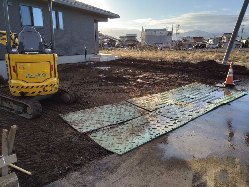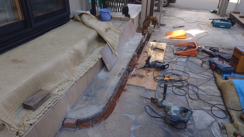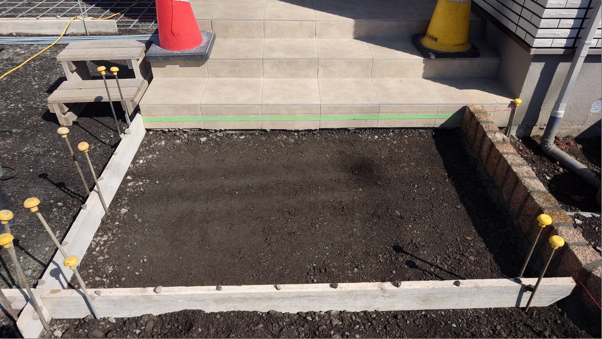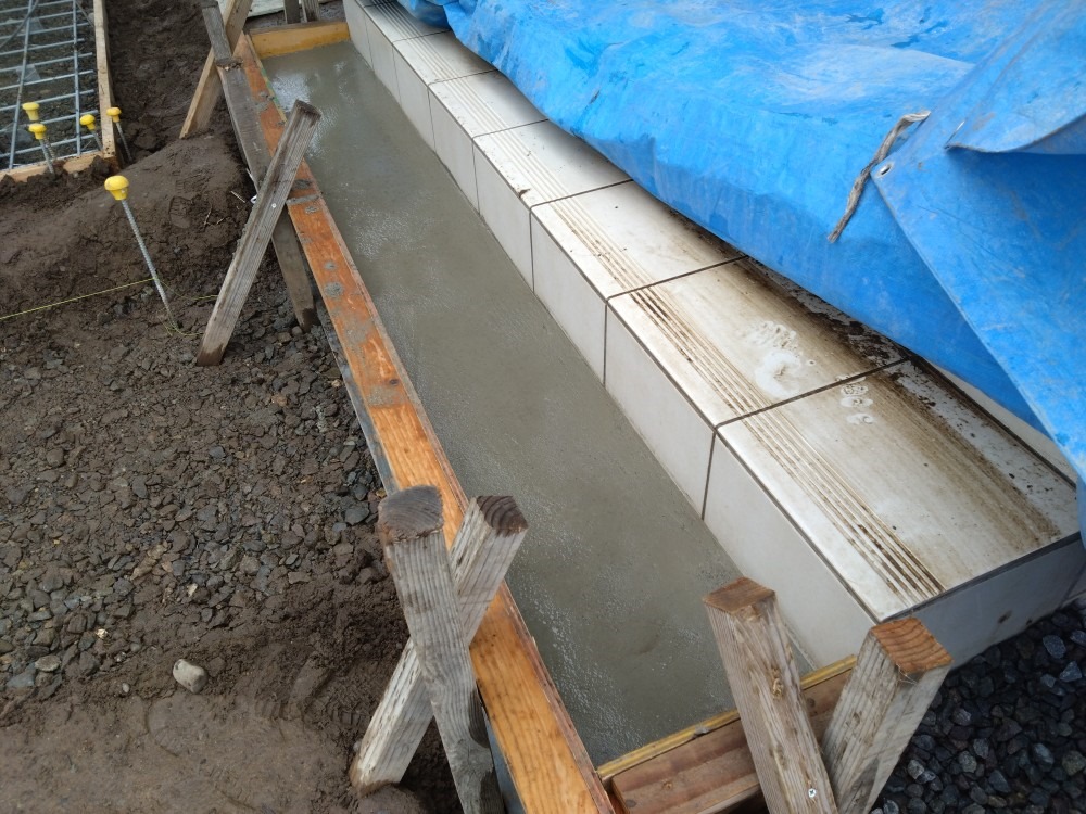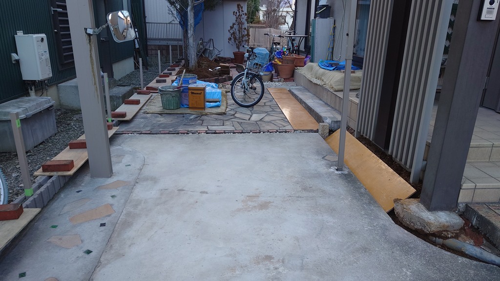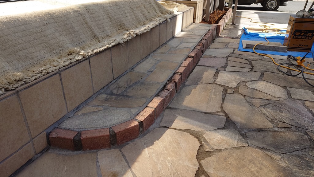 雨が降ると作業に影響がでますが良い一面もあります。概ね完成している現場ではサウザンドブリック(レンガ)や植栽帯が濡れて色がハッキリ見えます。ランダムに敷き詰めた様々な色のレンガが雨に洗われて綺麗に見えますね。ランダムとは言いましたが配置のバランスも職人が調整しながら行いました。大きさも異なるので偏らないように。水に濡れると硬化する特殊な珪砂を入れているため雨による流出も防いでいます。