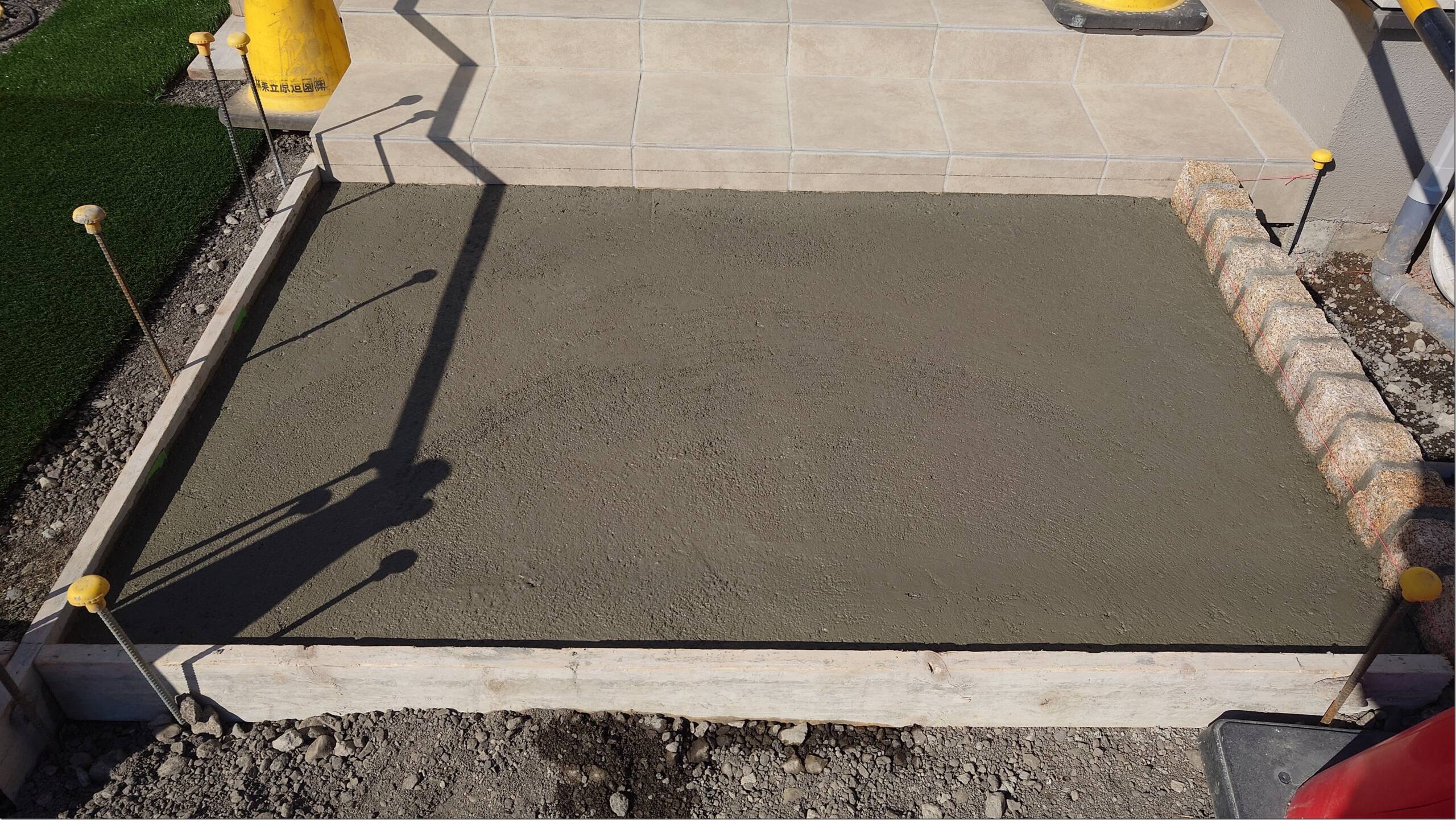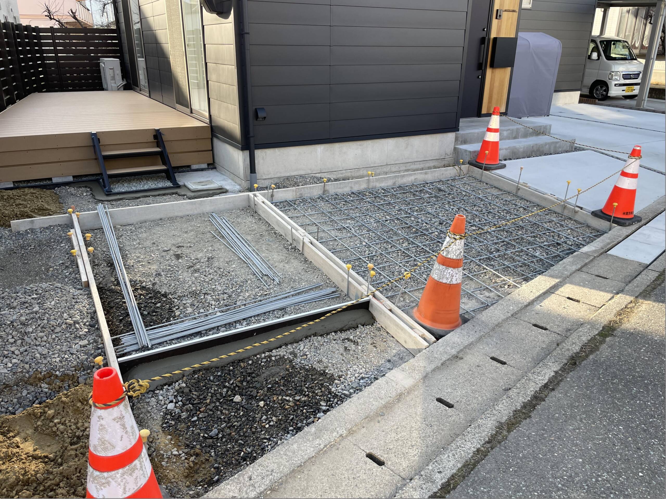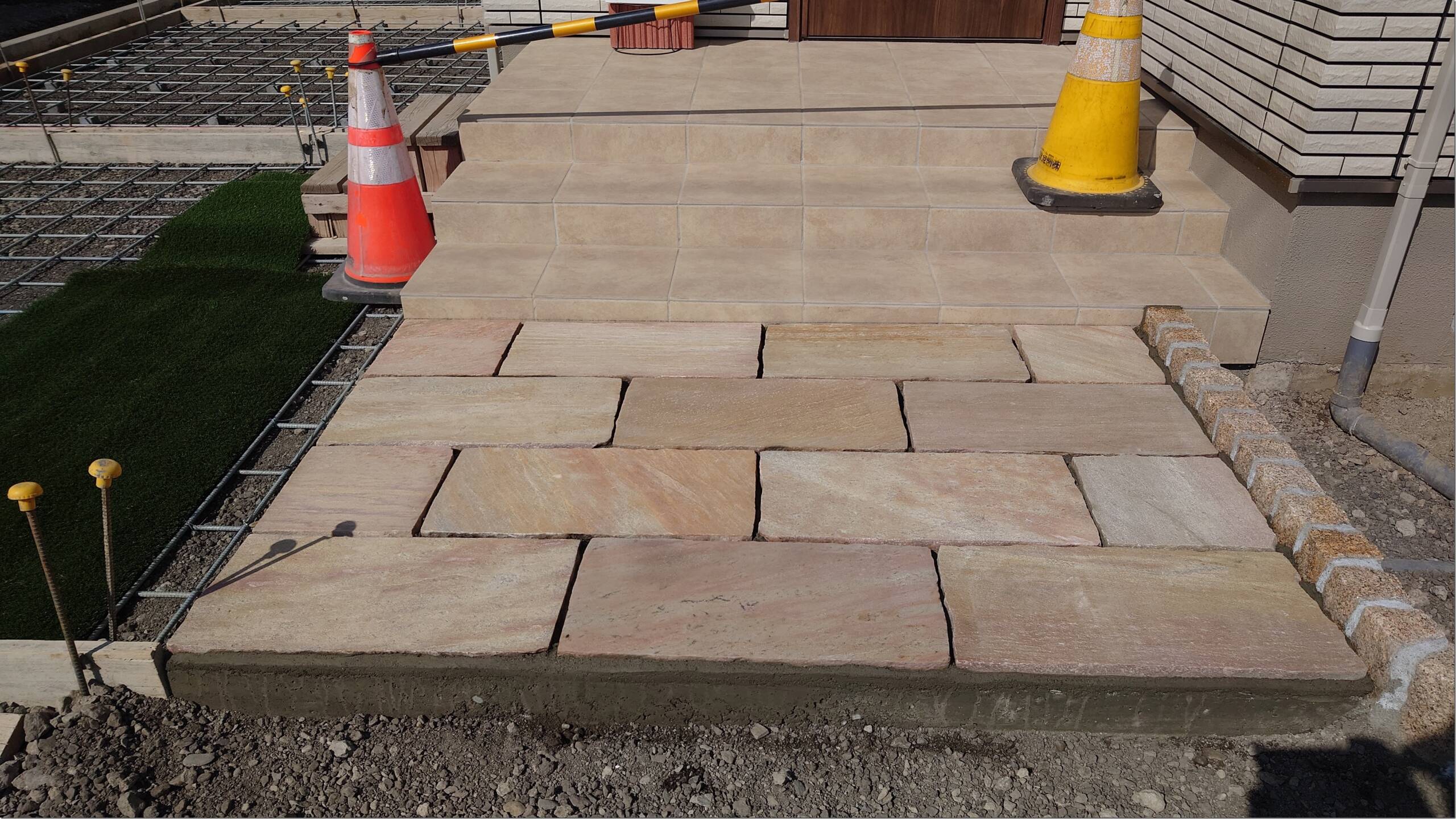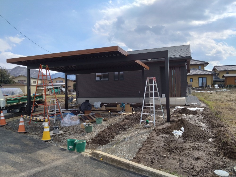 アプローチ脇には門柱を積み、足元には低木や下草を植えました。見栄えを良くするために据えた荒倉ゴロタも雨に濡れて綺麗に見えます。弊社では植栽帯に樹木と合わせて石を使います。石の存在感がより一層樹木を引き立たせてくれる大事なアイテムの1つだと考えています。そして、建物周りはファイングラベル(菜の花タンベル)という化粧砂利を敷き詰めました。外壁の白に映えてとても明るい印象になりました。もちろん防草シートを下に敷いてあるので雑草対策もバッチリです。