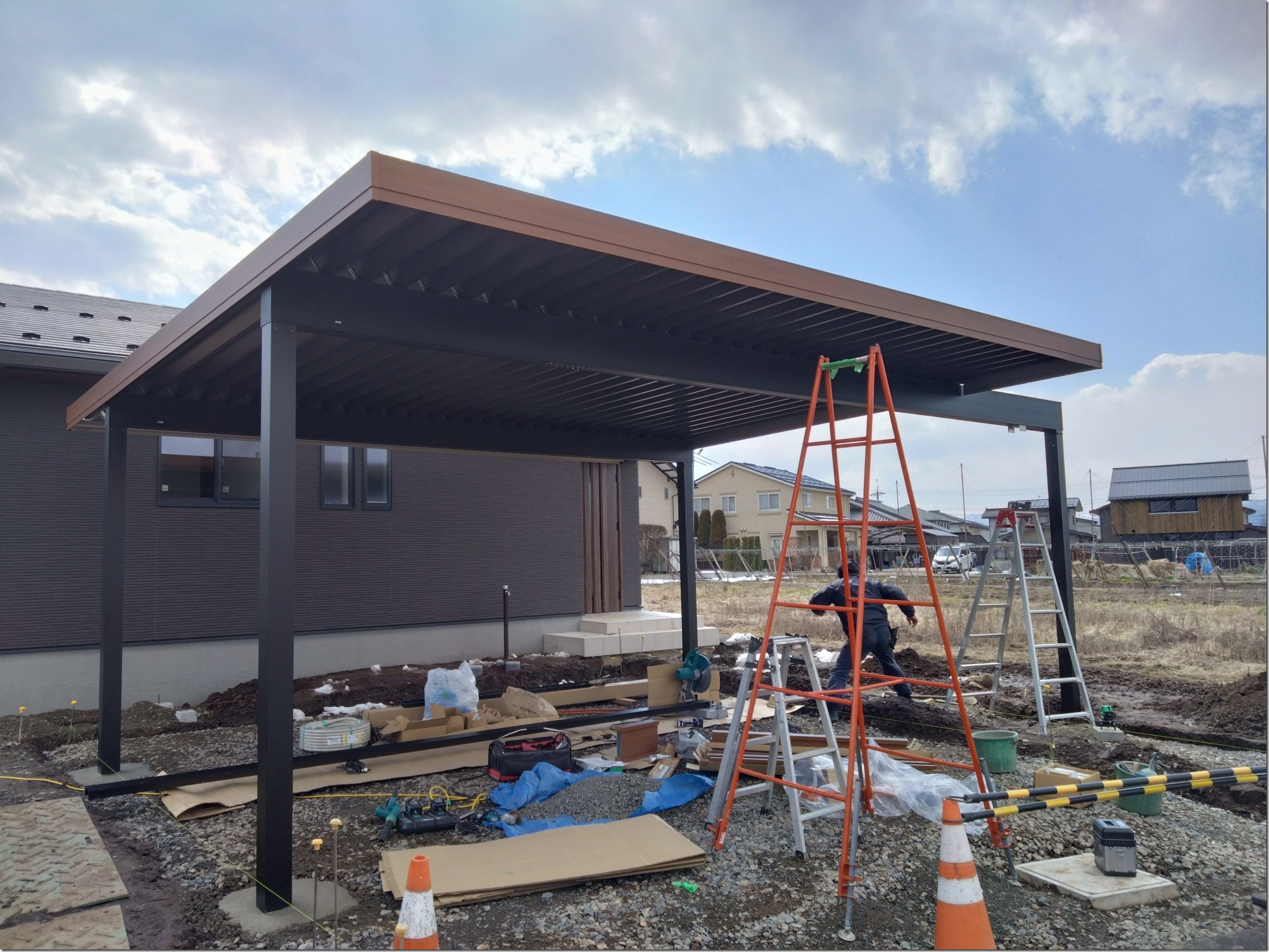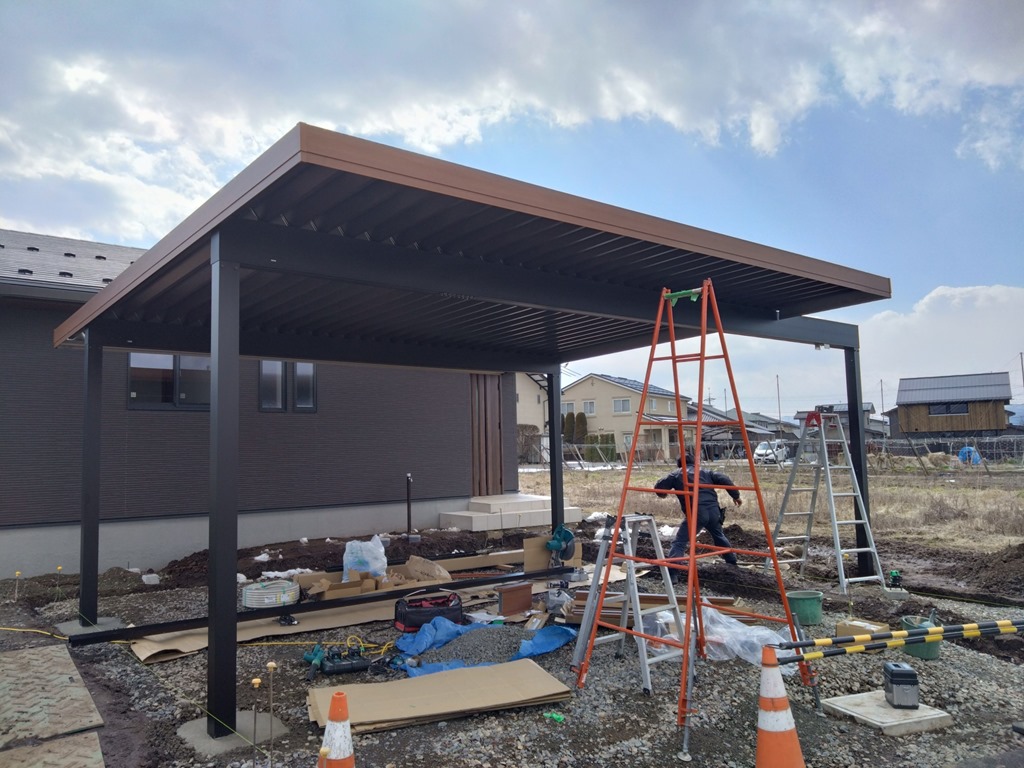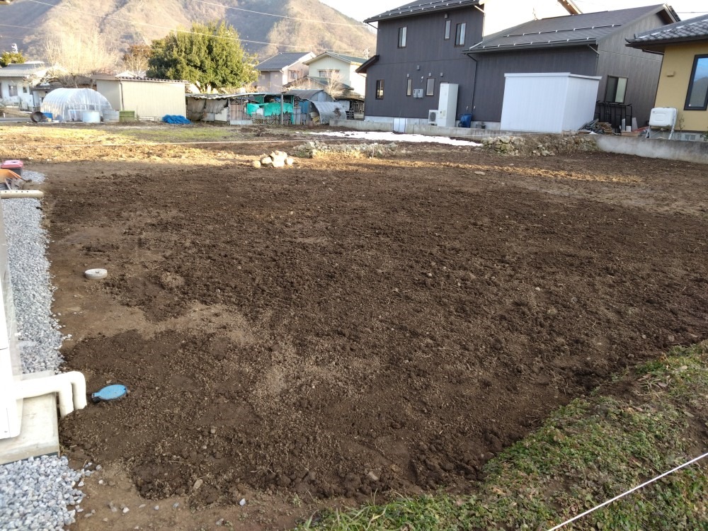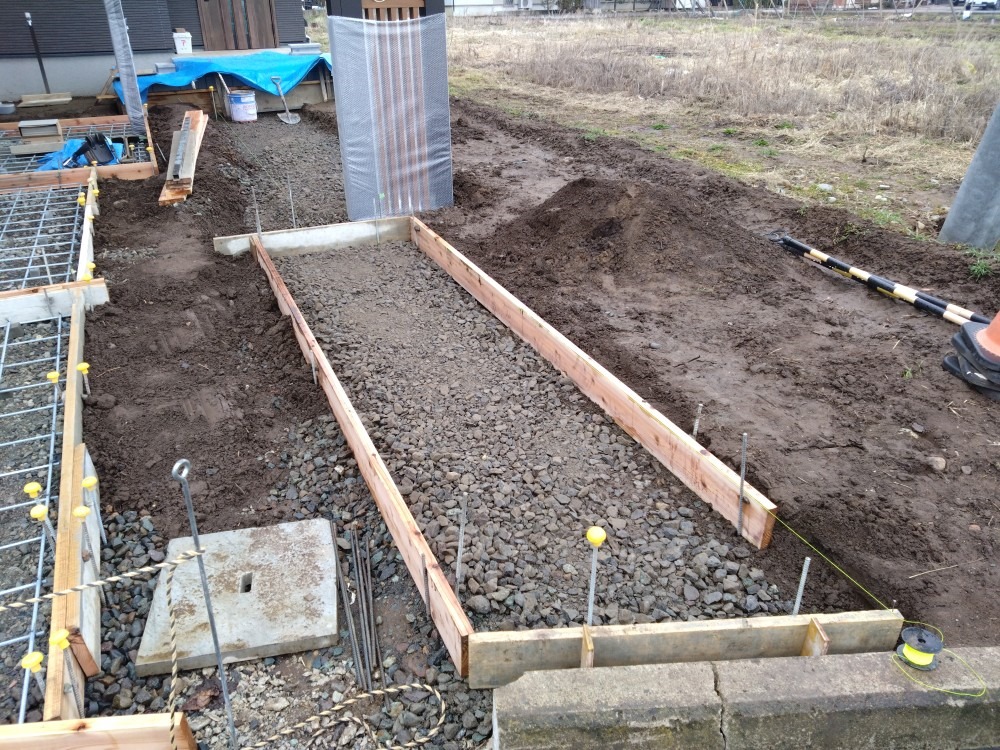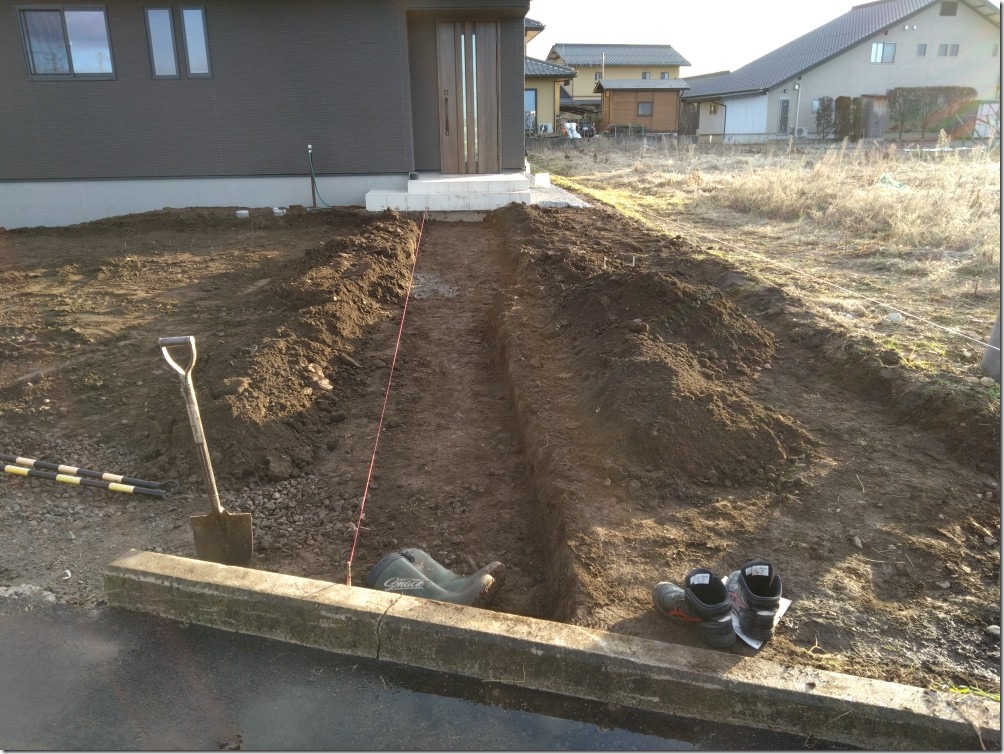 アプローチ脇には門柱を積み、足元には低木や下草を植えました。見栄えを良くするために据えた荒倉ゴロタも雨に濡れて綺麗に見えます。弊社では植栽帯に樹木と合わせて石を使います。石の存在感がより一層樹木を引き立たせてくれる大事なアイテムの1つだと考えています。そして、建物周りはファイングラベル(菜の花タンベル)という化粧砂利を敷き詰めました。外壁の白に映えてとても明るい印象になりました。もちろん防草シートを下に敷いてあるので雑草対策もバッチリです。