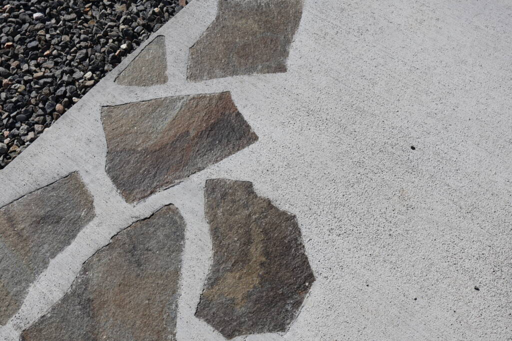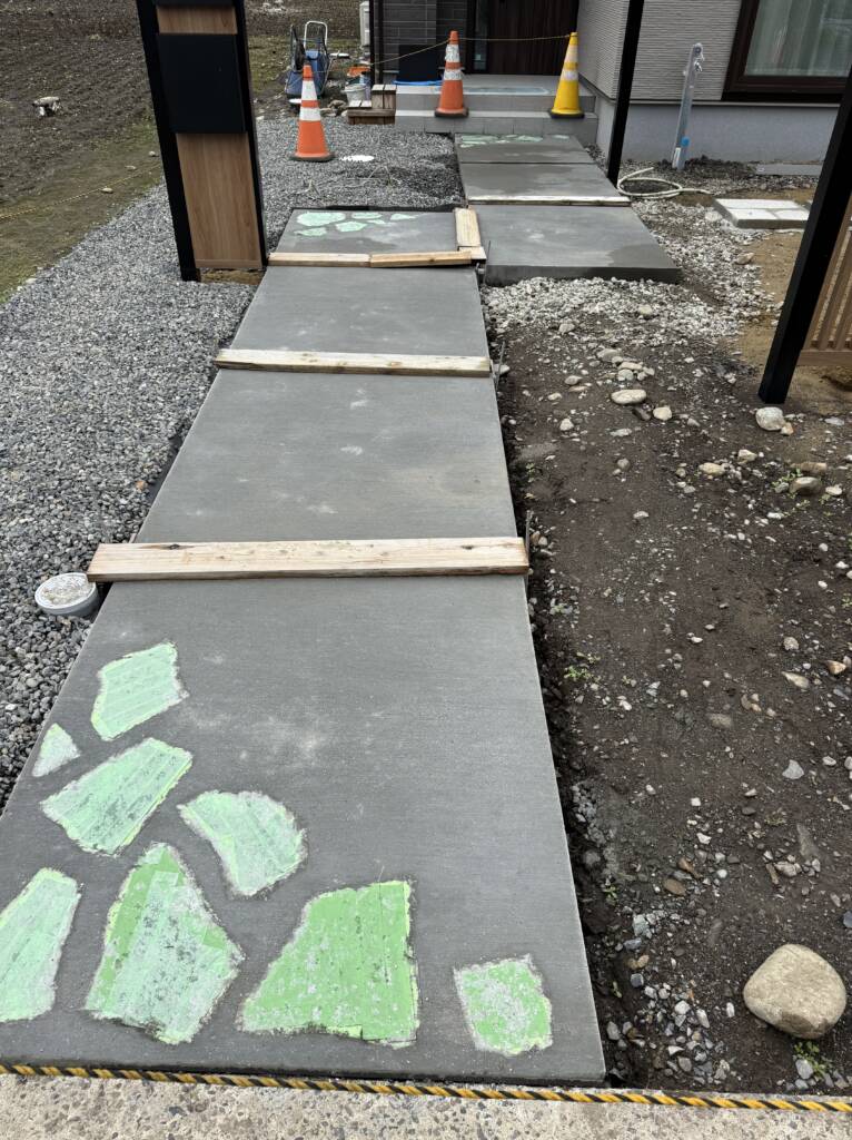 今日はこちらの現場で、インターロッキングの下地と据え付けを行いました。今回使用したのは、キセキという300×300の大きさの商品です。インターを据える場所と門柱前の植栽帯になる場所が隣接しているため、門柱前に枠を組み、植栽帯の部分に砕石が流れないようにコンクリートで押さえました。インターロッキングはお客様の動線になる部分になるので、下地をしっかり決め、水糸で高さを見ながら段差のないよう据えていきます。道路際は斜めの加工が入りましたが、きれいに据え終わりました。二枚目の写真の右側の空いているスペースと、左側の砕石の部分には、隣にある既存のインターロッキングと同じものが入る予定です。