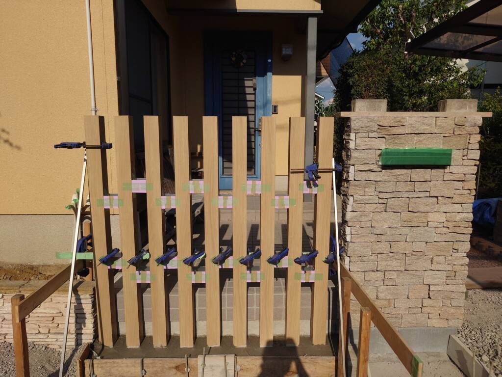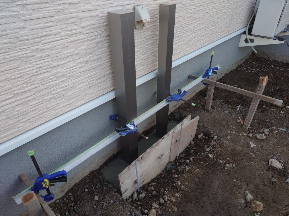今日は、こちらの現場で化粧ブロックの施工とフェンス柱の建て込みを行いました。前回は二段目の途中までだったので、その続きから積みました。目地を入れ、穴にモルタルを詰めたらフェンス柱を立てていきます。お客様から、画像奥の大きな窓手前は、フェンスを外したら通れるようにしてほしいと要望があったため、そこにはまだ柱は入れていません。
