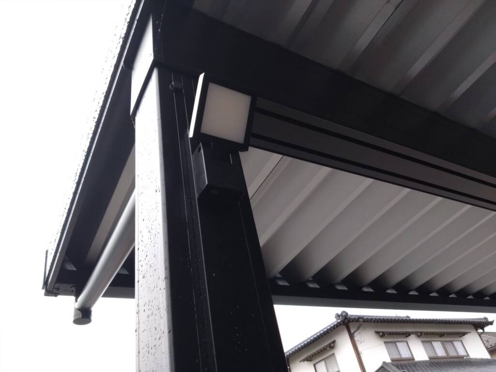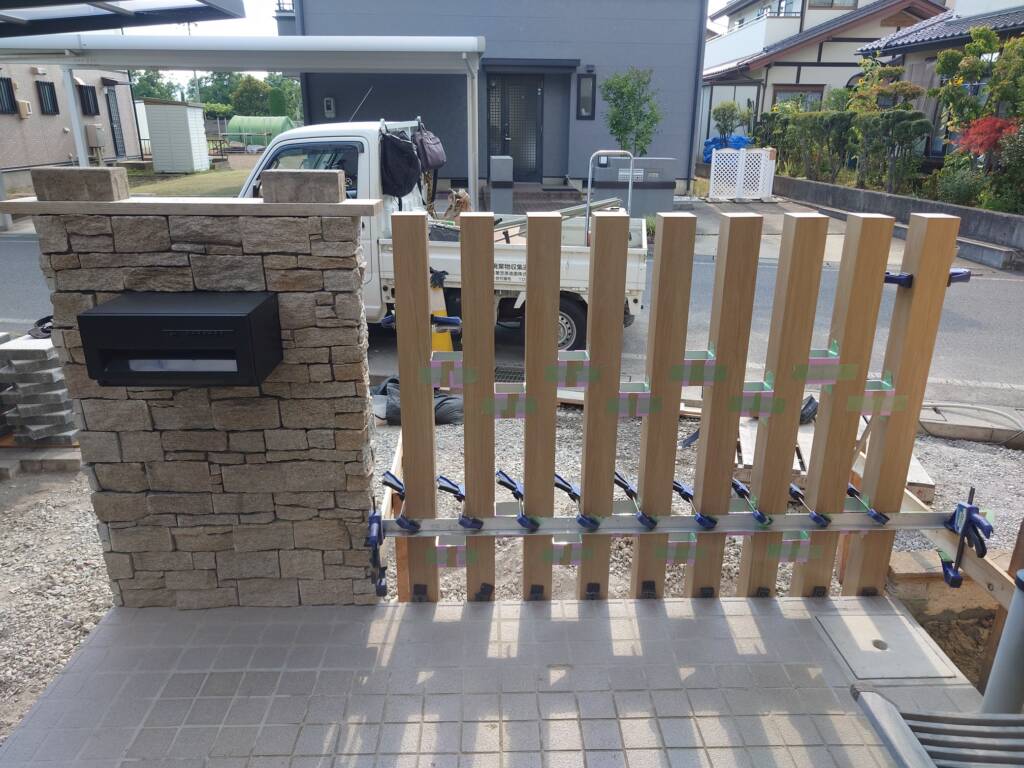 別の現場ではアプローチ脇の緑化ブロックの加工、据え付けを行い門柱となるディーズガーデンのアルモスリムを立てました。車庫側では1台用のカーポートのエフルージュの組み立てをしました。カラーはホワイトになり、レンガ目地や天然石目地のホワイトと合わせ一体感を生みます。