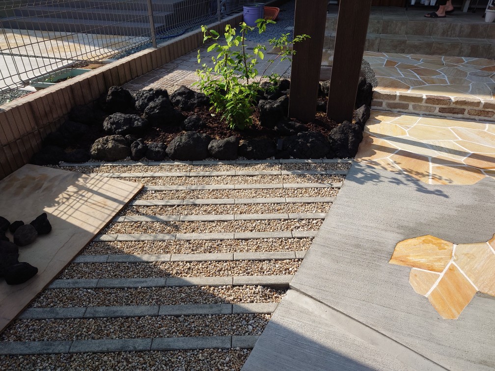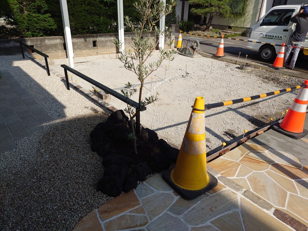 今日でこちらの現場は一旦区切りになります。写真にある山砂の部分に芝貼り、ほかにも植栽工事があるのですが、植物の状態を鑑みて、涼しくなった時期から再度入る予定です。