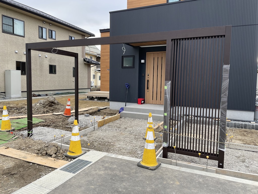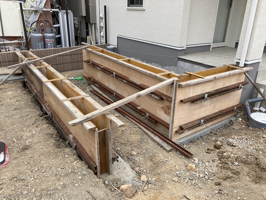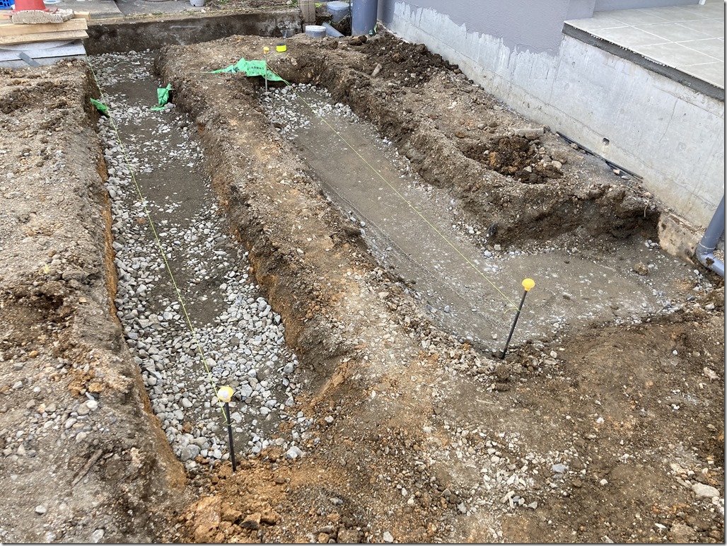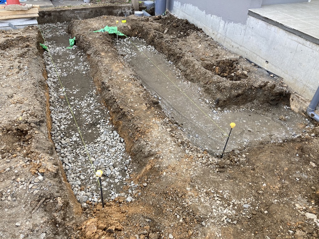 完成間近!土間下地。 7月9日(金) 来週打ち込み予定の土間の型枠鉄筋作業をしました。降ったり止んだりのグズグズの天気でしたが準備完了です!あとは天気だけ! 先週コンクリートを打った現場の型枠外しをし、周りに化粧砂利のクラッシュマーブルのイエローを敷き詰めました。 奥の花壇スペースにはマホニア、ドウダンツツジなどの低木と下草を植え付けました。賑やかになりましたね。写真にはありませんがお隣のご実家の玄関に手摺りも設置できました。あともう少し完成します。 長野市 外構 エクステリア