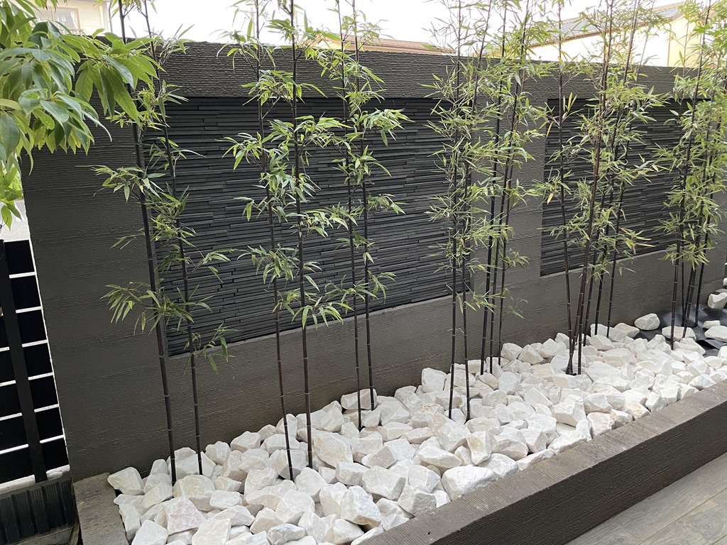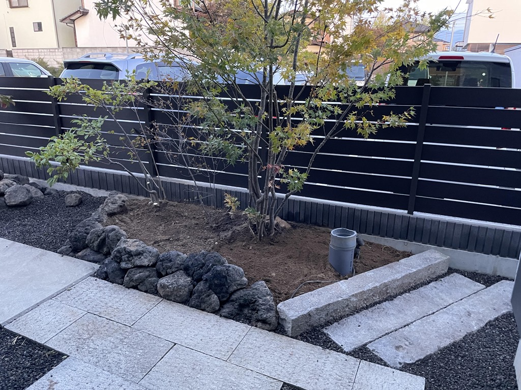 今日も各現場たくさんの施工中写真がありましたが少し割愛させていただきます。1件目は完成現場になります。荒倉ゴロタで植栽帯を引き締め、目隠しでマイティウッドを。アクセントにディーズガーデンのアルモスリムを建てました。内側タイルテラスを照らすスポットライトがナイスアイディア!