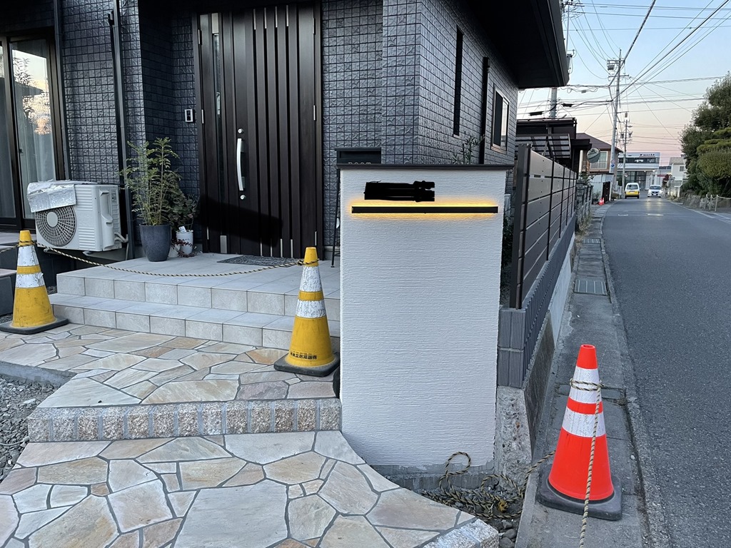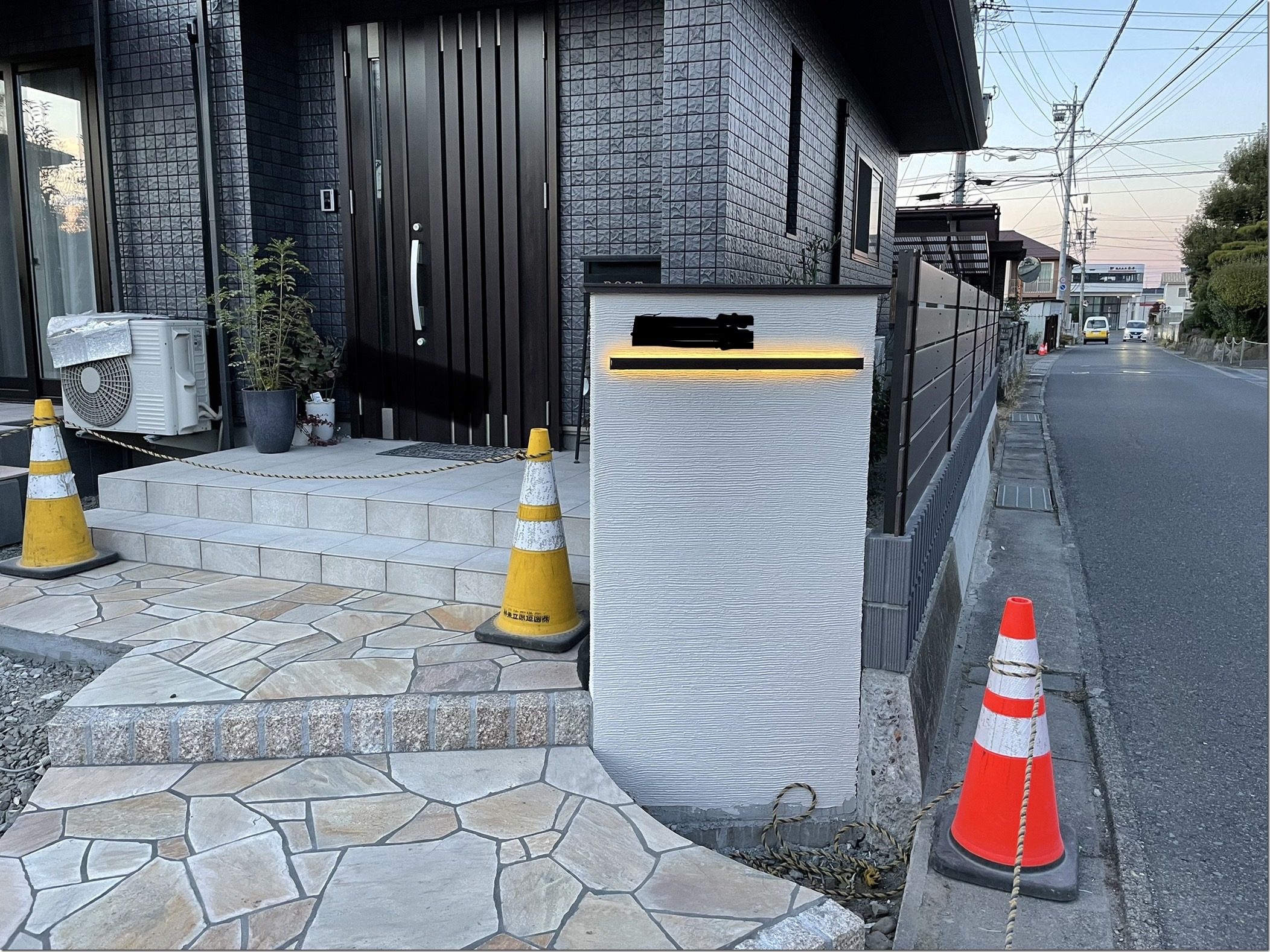 2022年1月31日 アプローチ(通路)、エクステリア、エクステリア工事、カーポート、ベースコンクリート打ち、千曲市、外構工事、天然石貼り、長野市、門柱工事 toledo