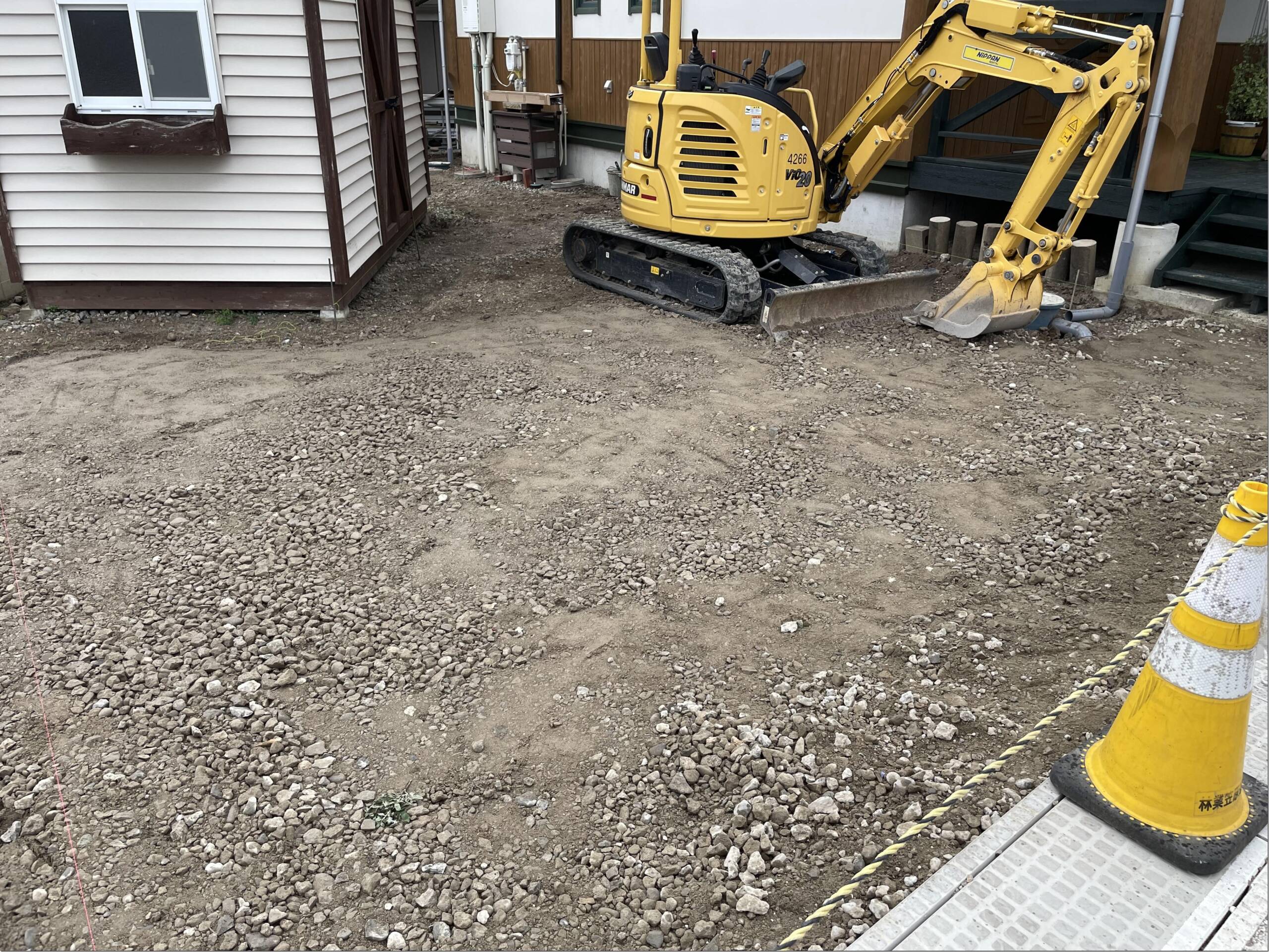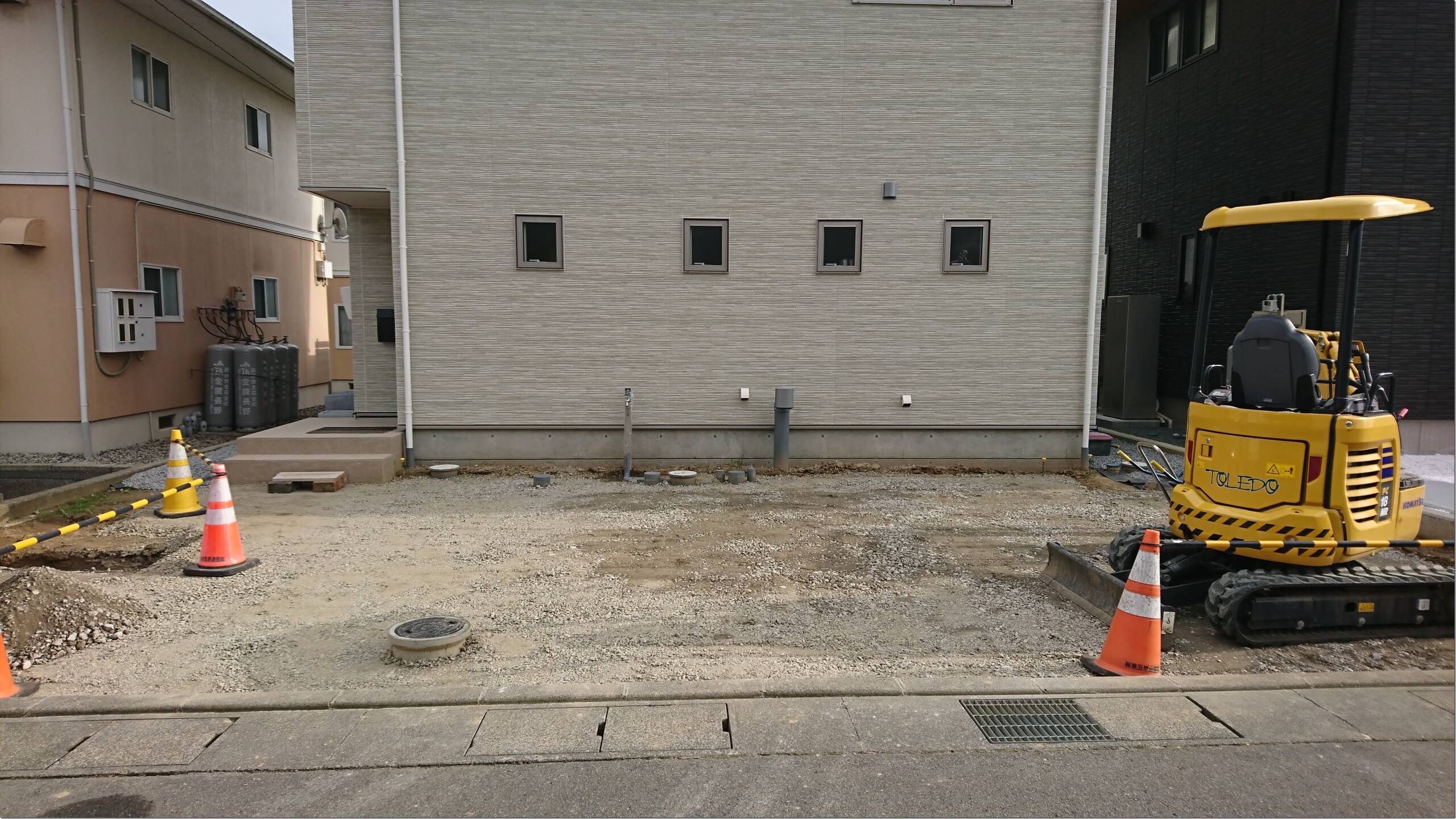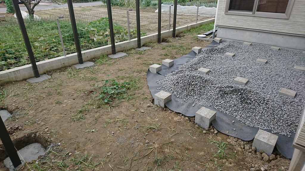 建物の西面、北面の敷地内に仕切り材を設置し、5号砕石を敷均しました。お隣様との境界線上であるため、しっかりと水糸を境界杭どうしで結び真っ直ぐな、敷地境の出来上がりです。