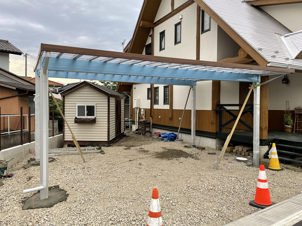同じお宅の正面には、カーポート(ソルディーポート)を組み立てました。後ろへの水勾配であるため、正面間口、高さが大きく車の出入りも気持ちよく感じられます。カーポート下には、コンクリート打設の型枠を組み始め、明日、残りの型枠と配筋をし、土曜日にコンクリート打設となります。秋晴れの毎日でとても気持ちよく仕事ができ、何よりでございます。