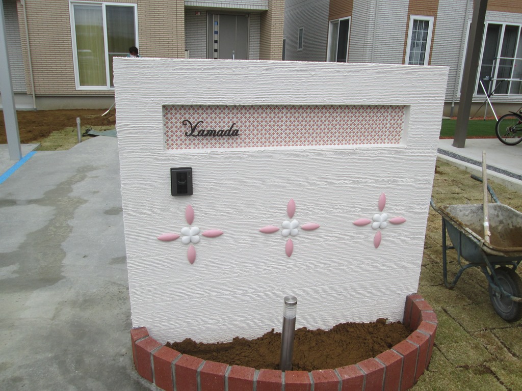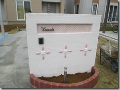 門柱にジュエルグラスを取り付け、モルタルで下地塗りをしました。