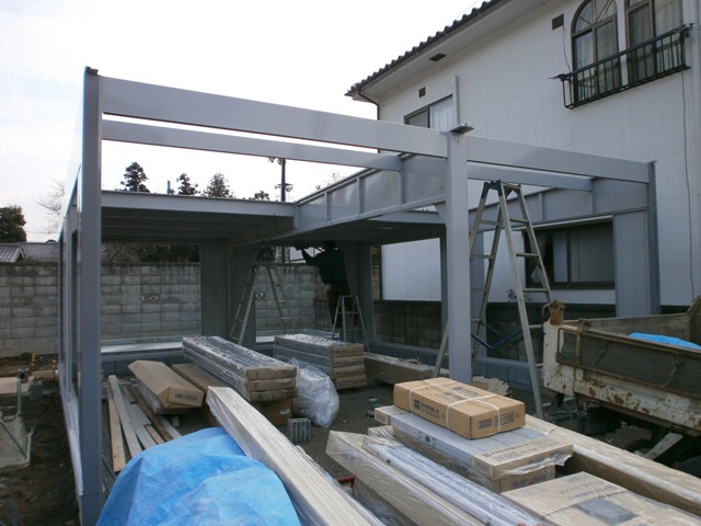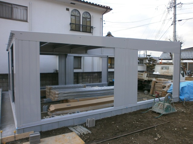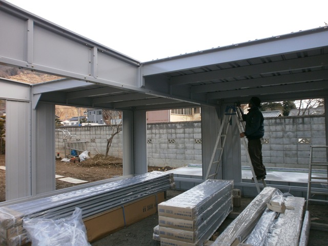 ガレージ組み立てと土間コンクリート打ち K様邸 3月7日(水) 千曲市K様邸施工現場 2台分のガレージも土間コンクリート打ち完了 そして先に土間コンクリート打ち済みの1台分ガレージも組み立てにはいりました