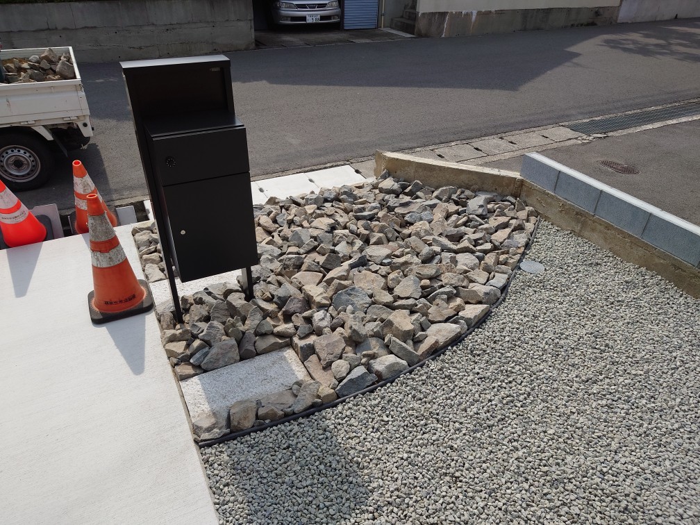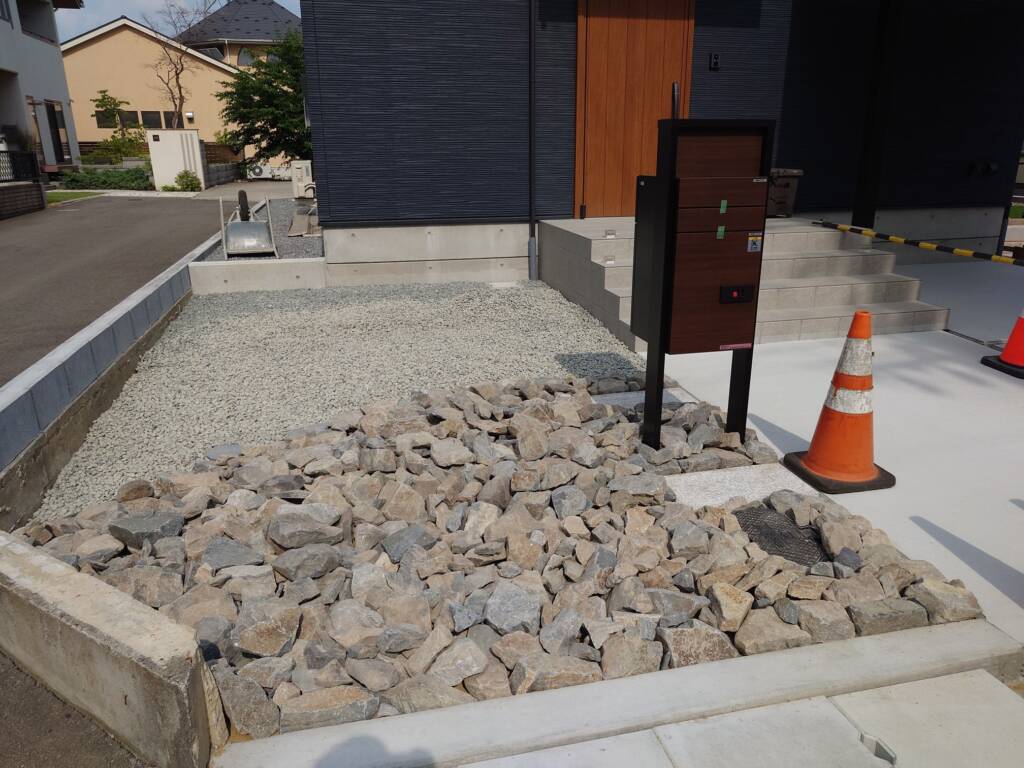今日は現場の画像がないため、過去の完了現場の紹介をします。この現場は、モデルハウスでの仕事で、玄関前の土間の打設、植栽と浅間石の石組みをしました。土間の打設が玄関前だったため、打設の際はしっかりと養生をして作業しました。写真には写っていませんが、目地はファイバーレジンを使用しました。植栽は、ソヨゴなどの大きめなものもあったため、ユニックで運び込んで吊り上げながら植えました。場所が玄関前と道路際の目立つ部分だったので、周りから見た時の全体の姿を確認しながら植栽と浅間石の石組みを行いました。普段の現場と違い、モデルハウスに訪れたお客様全員が見るものなので、より見た目に気を付けながら作業をした現場でした。