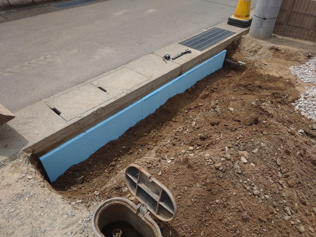 今日は、こちらの現場でスキ土とスタイロの埋め込みを行いました。排水管などの埋設物を傷つけてしまわないよう、気を付けながらスキ土をしました。スタイロは、写真に写っている水色の発泡スチロールのような板で、道路側との緩衝材の役割を持っています。
