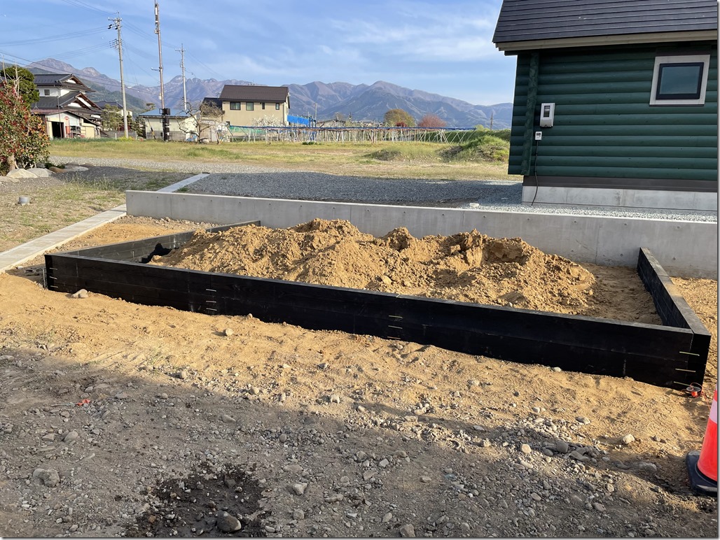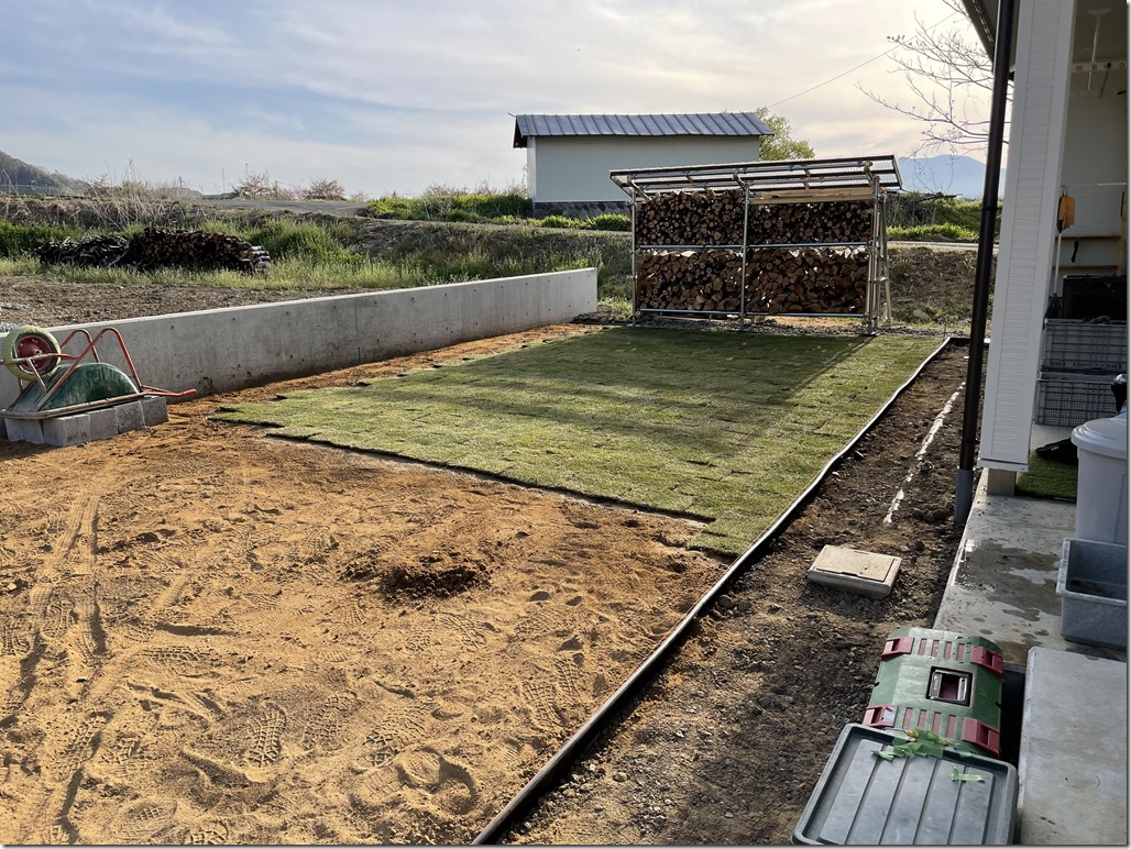 今日はこちらのお宅でスキ土の続きと芝を貼り始め、畑の土留めに枕木を据えました。