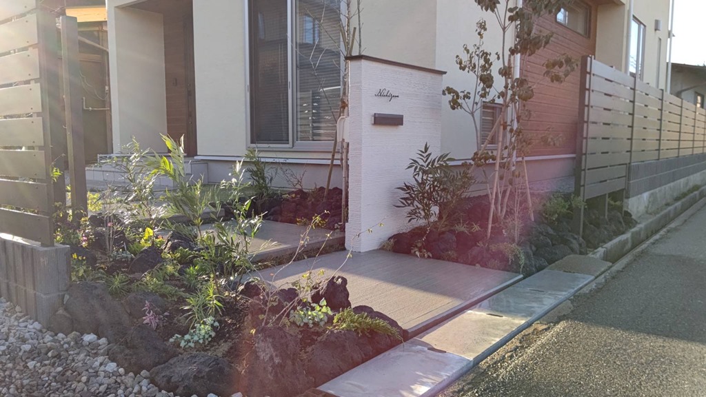 こちらのお宅では門柱、ポール裏にそれぞれアオダモとナナカマド、門柱横にはソヨゴを植えて浅間石を組みながら下草をブルーカーペットやラミウム、イワカスミソウなど石組みに合わせた植栽をさせていただきました。