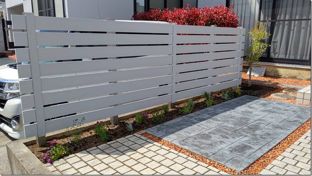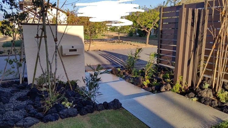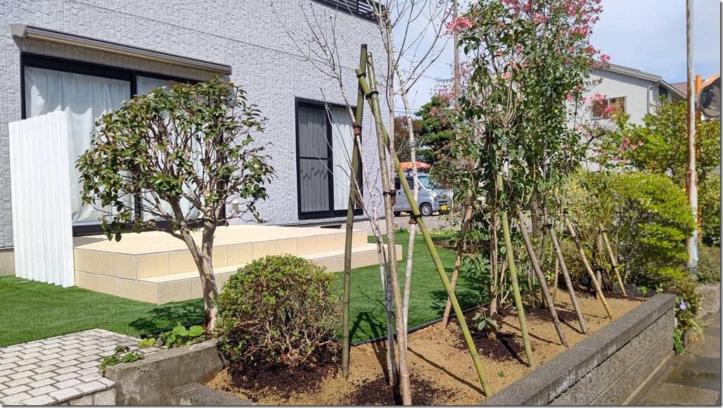 ここからは昨日の写真ですがこちらのお宅では道路沿いに高木のソヨゴやジュンベリーを、アプローチ沿いの植栽スペースにはチェリーセージやノコギリソウ、ローズマリーなどを植えさせていただきました。