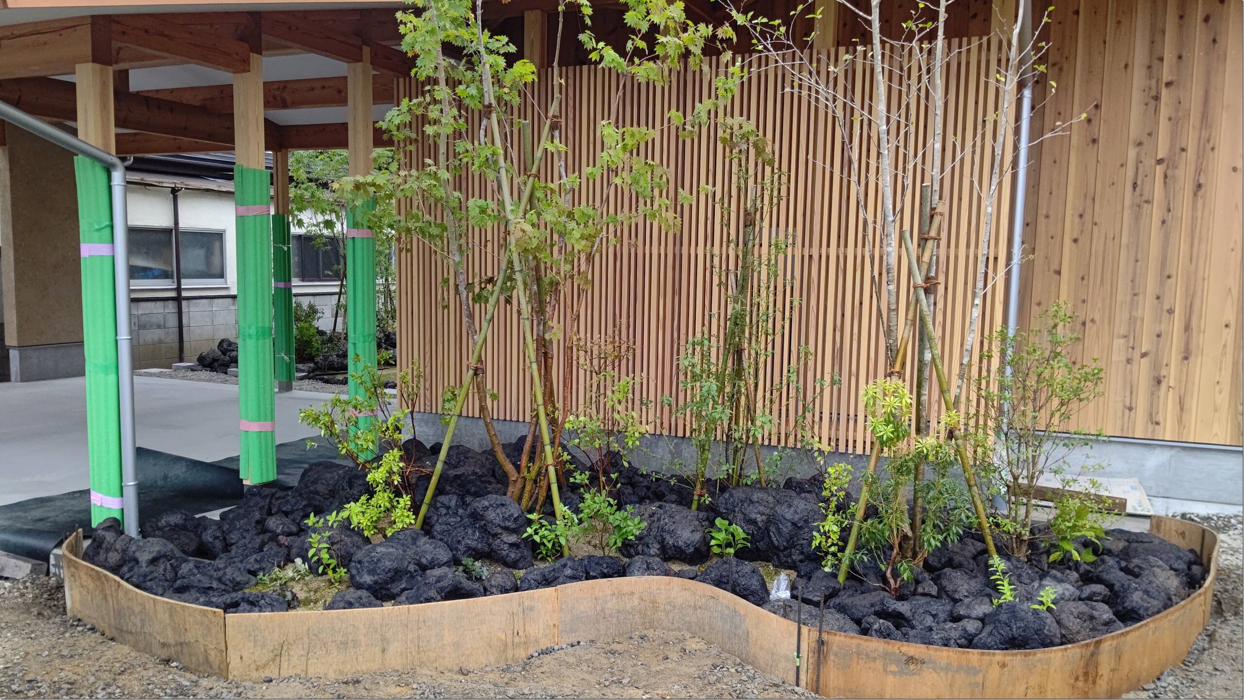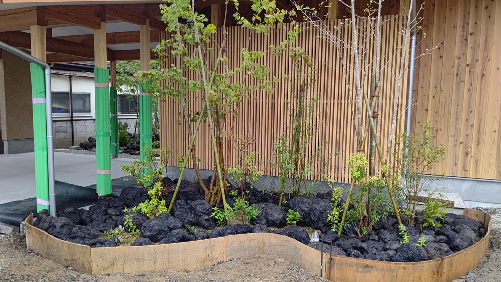 主庭の中庭も先日完成しており、こちらの樹種は、コハウチワカエデ、アオハダ、クロモジ、アセビなどを配置。山里や高山の岩場の自然な感じの風景をイメージしつつ、自然の一部分をくりぬきここに再現!