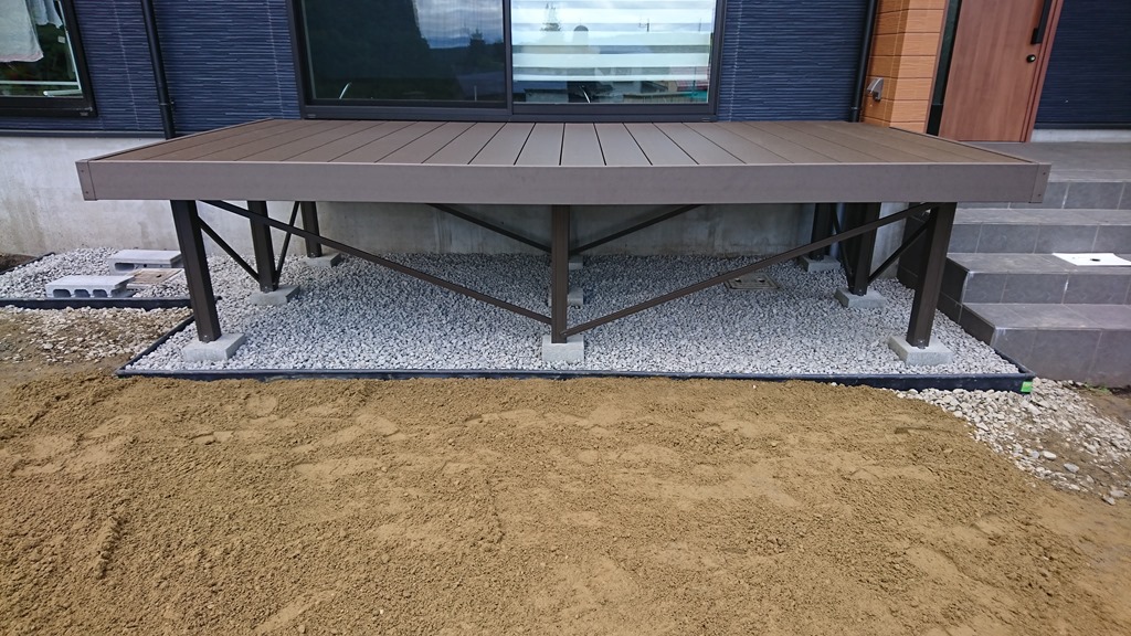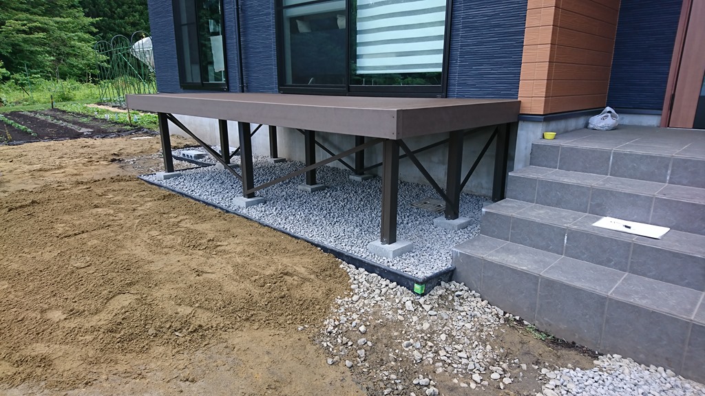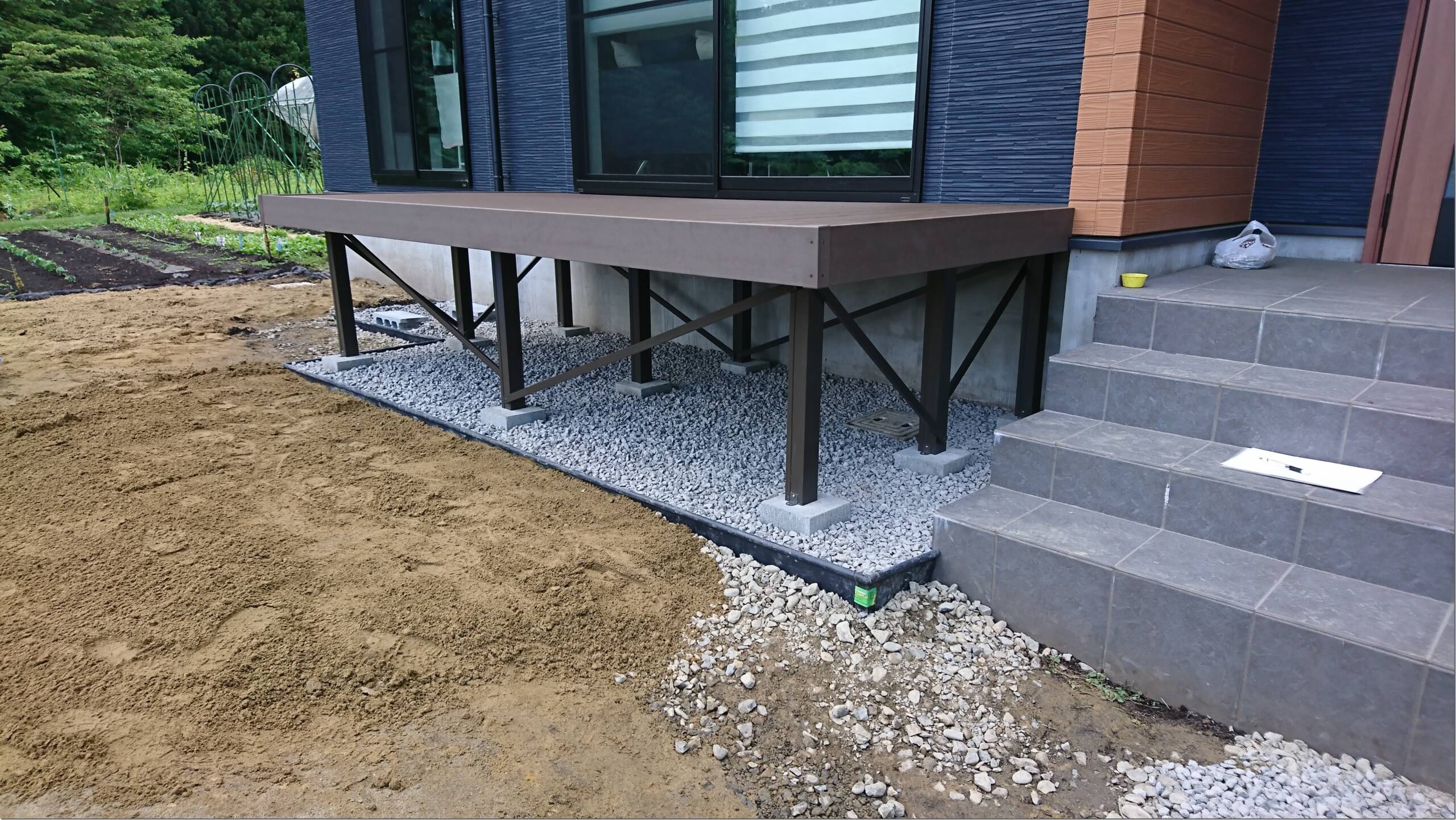 玄関横にウッドデッキテラスの完成!雪国であるため、建物基礎等も高く、窓際に合わせ部屋からの出入りもスムーズに。通常よりは長めのロング柱、筋交いを入れてあるため丈夫な構造です。