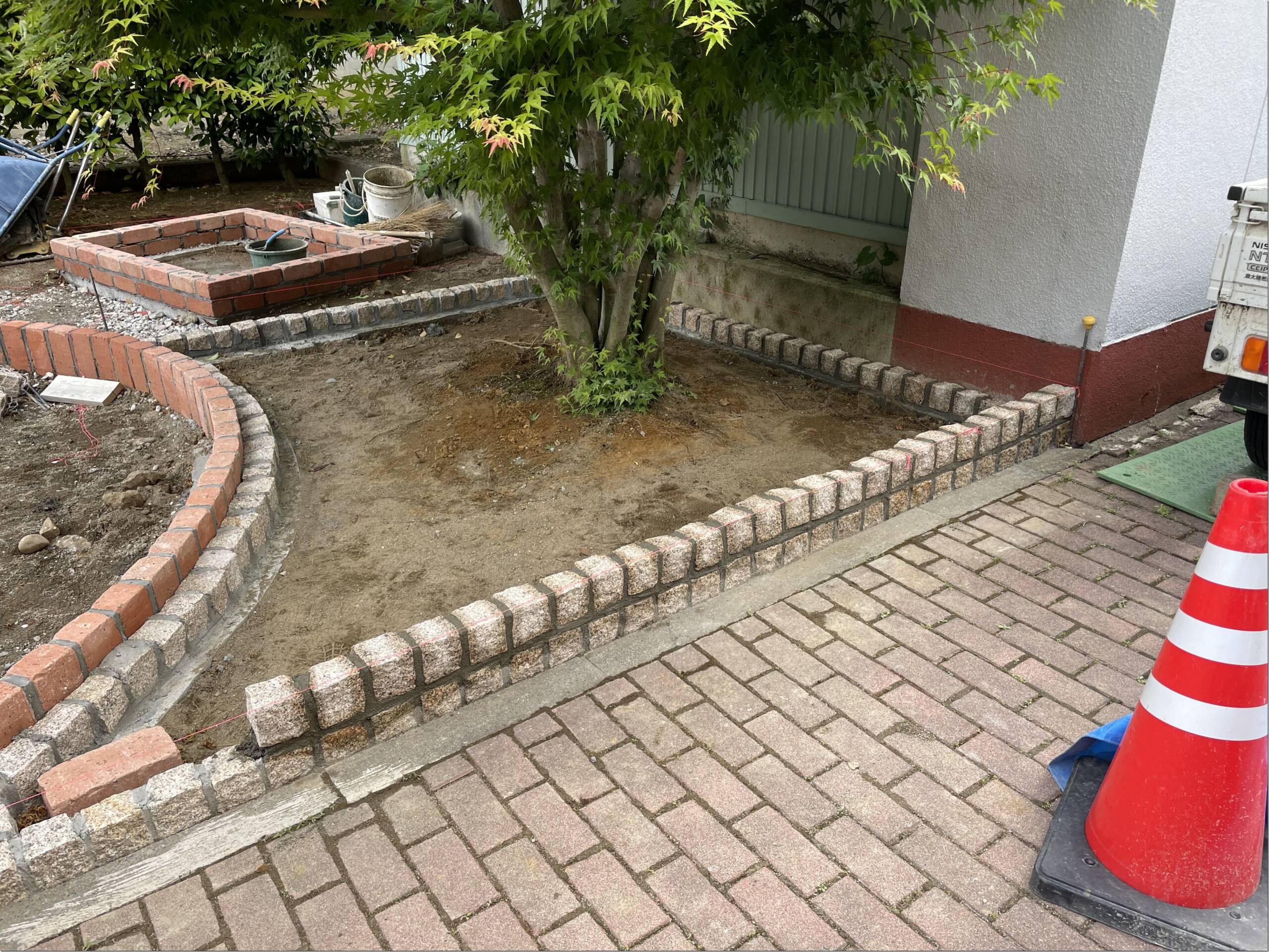 既存樹木、ヤマモミジ周囲に御影石のサイコロ形のピンコロ石の2段積み。四角や円形の植樹帯、花壇。この中に沢山の色とりどりの草花…楽しみですね!