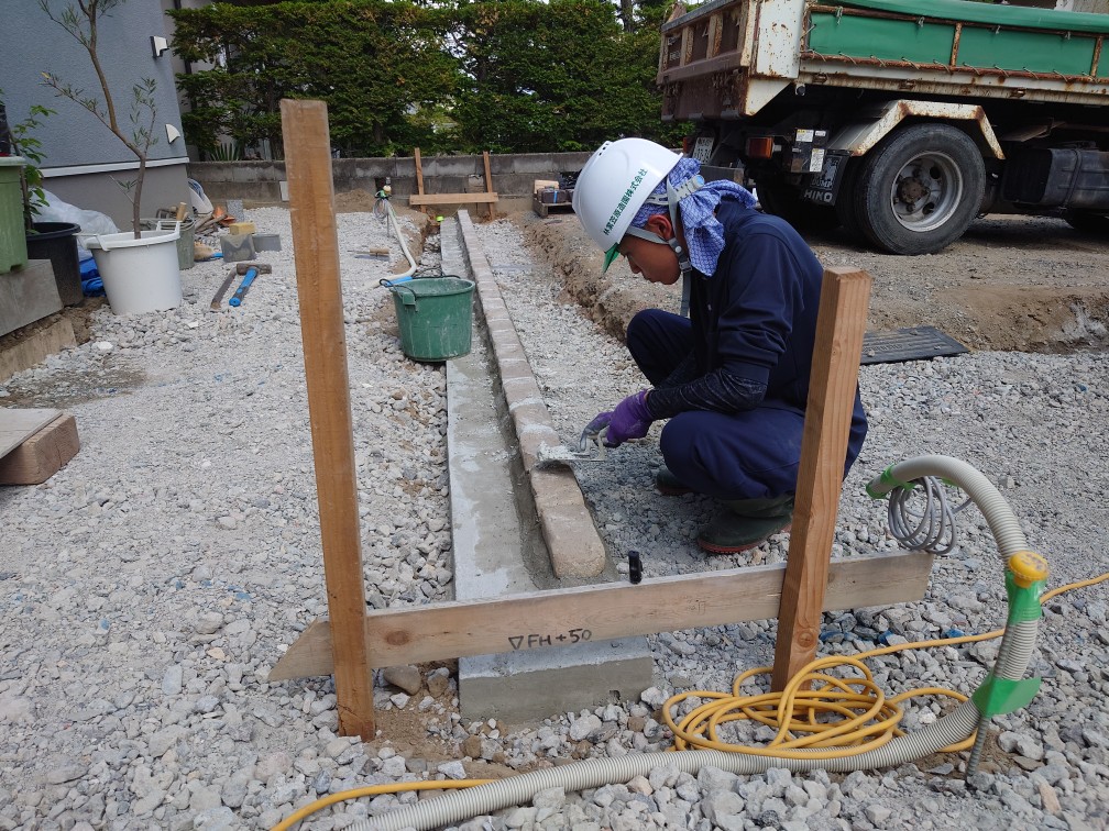 先日据え付けたプラーガブリックにジョイサンドハード(固まる珪砂)を入れて道路際を仕上げて車の乗り入れが出来るようになりました。土間スリットのファイバーレジンとアプローチのリンクストーンも硬化が確認が出来たのでバリケードを開放しました。リンクストーン内に埋め込んだ犬をかたどったワンポイントも綺麗に仕上がり、お客様にも喜んでいただきました。残工事に植栽が残っているのでもう少しで完了になります。冬場から着工させていただき春先までコンクリート打設をお待ちいただいてようやく竣工になります。お客様にも車両の移動等ご協力いただきありがとうございました。