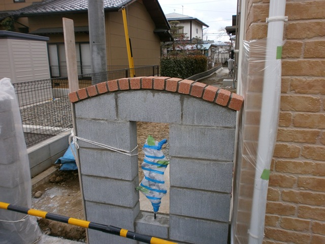 勝手口目隠し壁 M様邸 3月24日(土) くもり M様邸施工現場 門柱ではなく勝手口の目隠しのための壁です スリットをいれてアクセントにディーズガーデンのアールフィックスフェンスを入れました 天端にはレンガの笠木を取り付けました