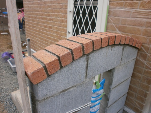 水道レンガ立て S様邸 4月16日(月) くもり 上田市S様邸施工現場 移動した水道の受けをレンガを立てて作りました 駐車スペースのコンクリート打ちの鉄筋を組みました テラス部分は水をかけて洗浄しました