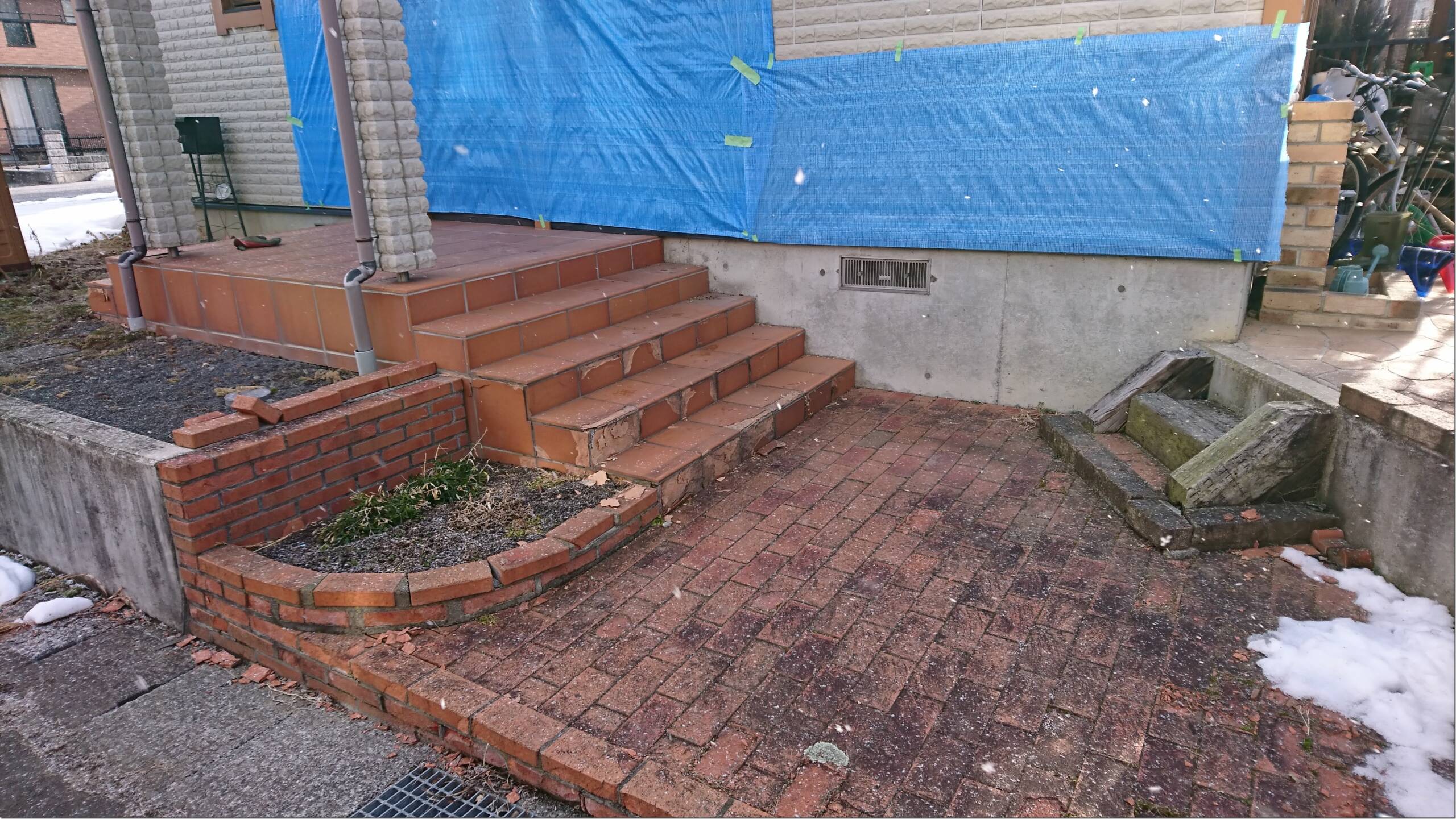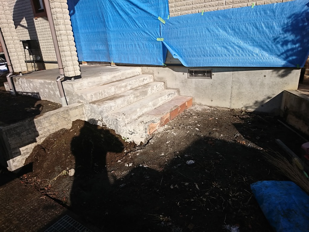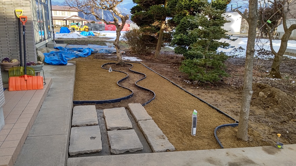 リフォーム!ビフォーアフターをお楽しみに! 2月17日(木) お庭をリフォームするため、既存の樹木を伐採し、景石を取り外しました。どのようなお庭に生まれ変わるのか、お楽しみに! 玄関前階段とアプローチのレンガやタイルが古くなり劣化してしまい、基礎が見えるまできれいに撤去しました。鉄平石貼りの階段に生まれ変わります。 玄関前に既存の板石と切石を移設し、山砂を敷き均しました。手前の板石からは白玉石の枯流れとなり、山砂部分は高麗芝となっていきます。 今日は、お昼頃の突然の雪でしたが、積もることなくお日様が顔を出してくれて助かりました。