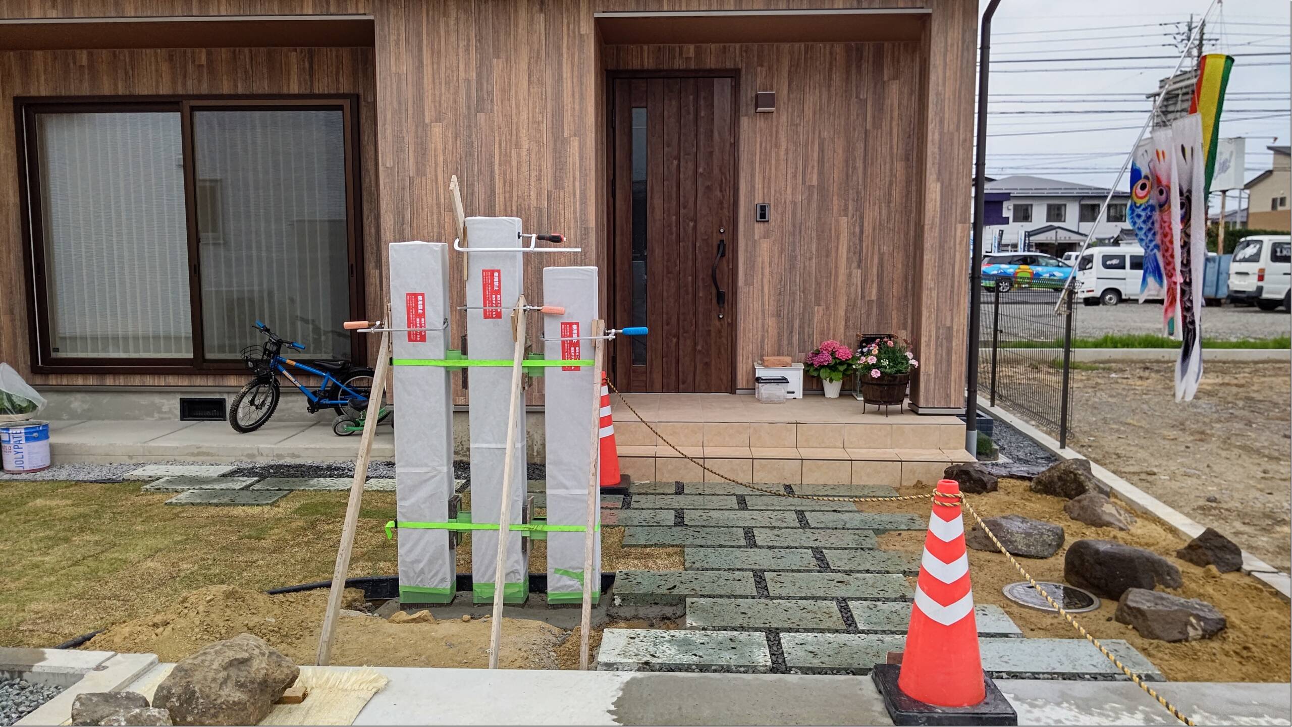 3本の養生中の柱が、あるのとないとでは、風景と立体感が違いますね!