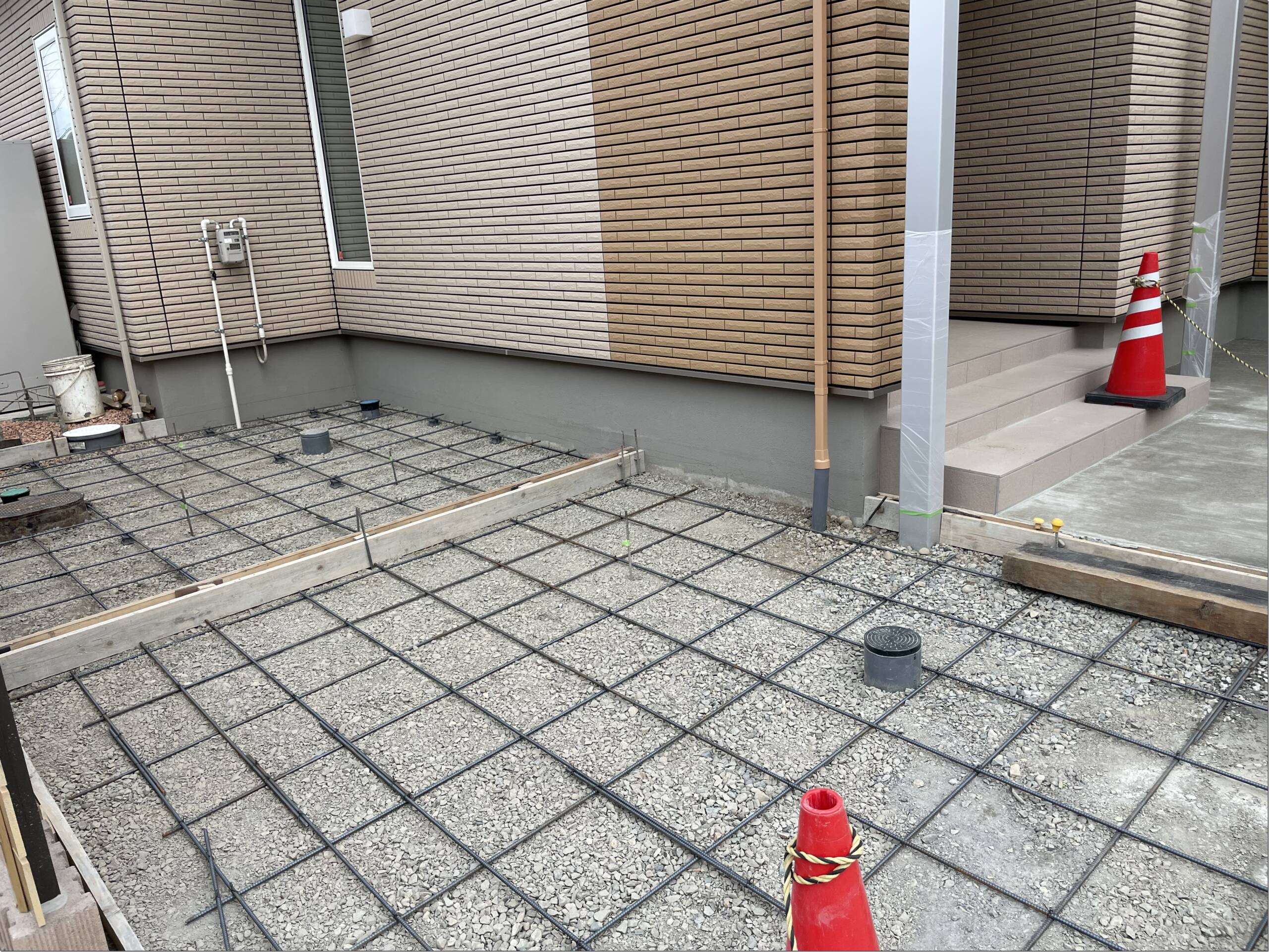 玄関横の土間コンクリートの下地。枠組みを行い、鉄筋配筋。型枠や汚水管の見えている高さが、コンクリートの厚さとなります。